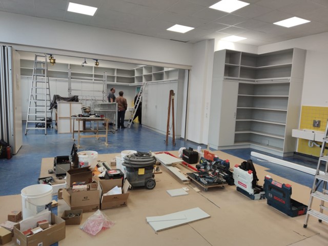 Die Highlights des neuen Kunstsaals sind die deckenhohen Schrankregalwände, die von unserer Kunstlehrerin Frau Langner und unserem Hausmeister Herrn Britten in Zusammenarbeit mit dem Schulsachbearbeiter des Regionalverbandes Saarbrücken Marc Lerchenfeld speziell für den Raum entworfen wurden. Diese maßgeschneiderten Regale bieten reichlich Stauraum für Werkzeuge, Schülerutensilien wie Zeichenblöcke und Farben sowie eine geordnete Präsentation von Schülerarbeiten. Die oberen Regalböden sind bequem über eine Leiter erreichbar, was die Nutzung des gesamten Stauraums erleichtert.