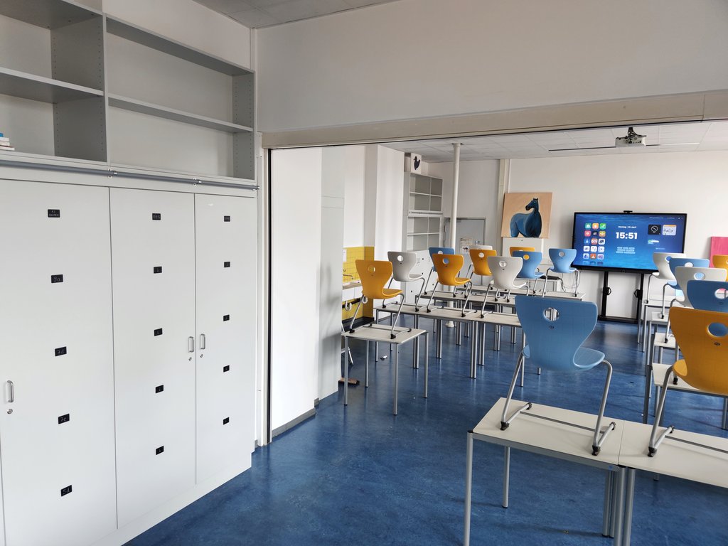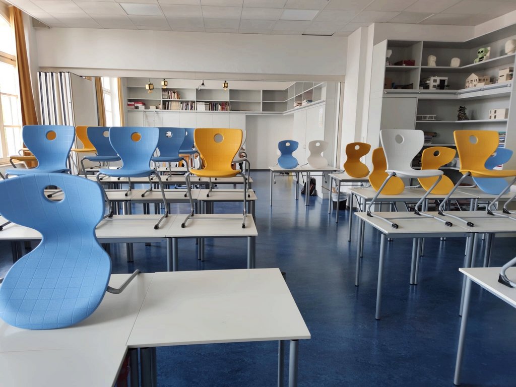 Zusätzlich zur neuen Ausstattung wurde der Kunstsaal und die hinaufführende Treppe frisch gestrichen. Die neuen Tische und Stühle fügen sich mit einem frischen Farbkonzept aus Blau, Gelb und Weiß harmonisch in den Raum ein und sorgen für eine angenehme Arbeitsatmosphäre.