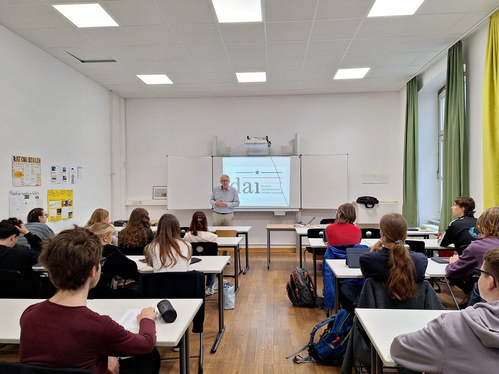 Am Montag, den 17.06.2024 fand ein Workshop für den Englisch LK von Frau Scheibe und den Englisch GK von Frau Kielburger der Jahrgangsstufe 11 statt. Es kam Herr Dr. Bruno von Lutz, der geschäftsführende Direktor vom Deutsch-Amerikanischen Institut Saarland (kurz: DAI) zu Besuch und informierte die Kurse über das politische System in den USA, die aktuellen Wahlen sowie über das amerikanische Wahlsystem. Zunächst erzählte er uns von der Gewaltenteilung und den Organen sowie von der „Constitution“, der amerikanischen Verfassung, die 1789 in Kraft trat und nicht wie bei uns in Deutschland verändert werden kann. Dort muss man mit „amendments“ (Zusatzklauseln) arbeiten. Anschließend haben wir uns angeschaut, welche politischen Institutionen es gibt, z.B. den „Congress“, ein Zweikammersystem, das in zwei gleichberechtigte Institutionen unterteilt wird: dem „Senate“ (Senat) und dem „House of Representatives“ (Repäsentantenhaus). Schließlich hat Herr Dr. Lutz uns erklärt, dass seit 1790 alle zehn Jahre der „Census“, eine Volkszählung, stattfindet, weil man in den USA kein Einwohnermeldeamt hat. Interessant war schließlich auch der letzte Themenpunkt über die aktuellen „US Presidential Elections“, die Präsidentschaftswahl, bei dem es um das Wahlsystem ging sowie darum, welche Bundesstaaten mehr auf der Seite der „Democrats” (Demokraten) und welche auf der Seite der „Republicans” (Republikaner) stehen. Dabei ging Herr Dr. Lutz auch darauf ein, wie die aktuelle Wahl zwischen Biden und Trump in diesem Jahr eventuell ausgehen könnte.