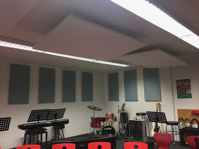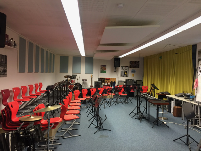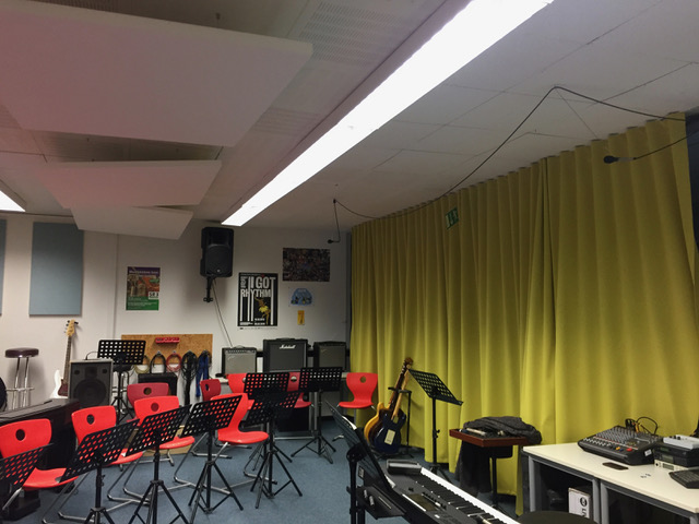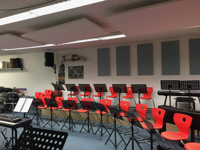 „007“?... so nennen wir unseren Proberaum in der Talstr. 27a. Seit 2015 sind die Bigbands und die Percussion AG in diesem Raum unweit unserer Schule untergebracht. Mit der Hilfe von Eltern haben wir die Räumlichkeit für die Bedürfnisse unserer Musikproben hergerichtet. Da die Proben mit Band oder Percussion-AG sehr laut sein können, haben wir besonders darauf geachtet, dass die Raumakustik möglichst schallreduziert ist. Deshalb wurden Akustiksegel und Schalldämmungsmatten installiert und die Glasfronten mit Decken verhängt. Diese Maßnahmen wurden bei der letzten Sicherheitsbegehung bemängelt und mussten aus Brandschutzgründen demontiert werden.