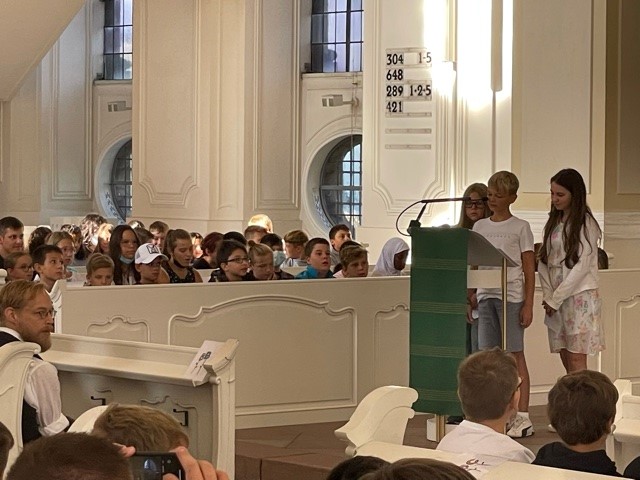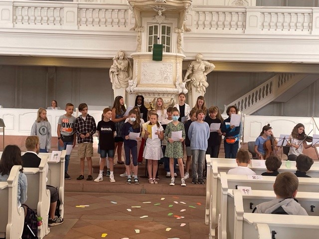 Kaum war es in der Kirche mucksmäuschenstill geworden, verzauberte die 6a unter Leitung von Frau Behr alle mit ihren Gesangs- und Kammermusikeinlagen. Besonders spannend dabei war, dass hier in verschiedenen Sprachen gesungen wurde – Sprachen, die ihr bald auch verstehen werdet.