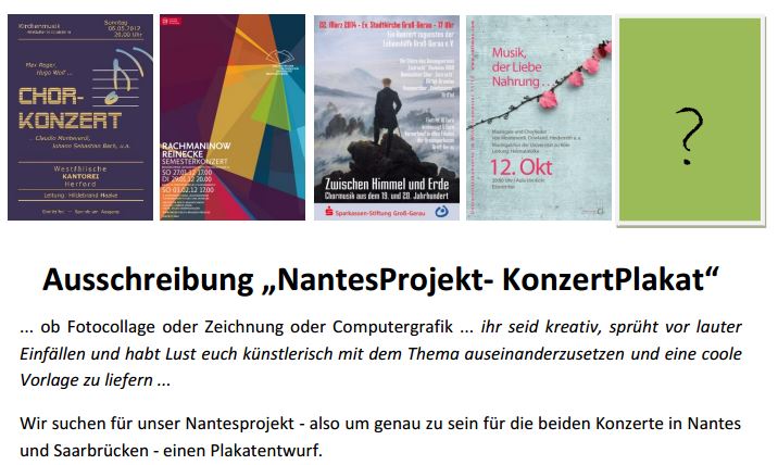 Wir suchen für unser Nantesprojekt – also um genau zu sein für die beiden Konzerte in Nantes und Saarbrücken – einen Plakatentwurf. Alle wichtigen Informationen zum Plakatgestaltungsprojekt findet ihr hier aufPDF.