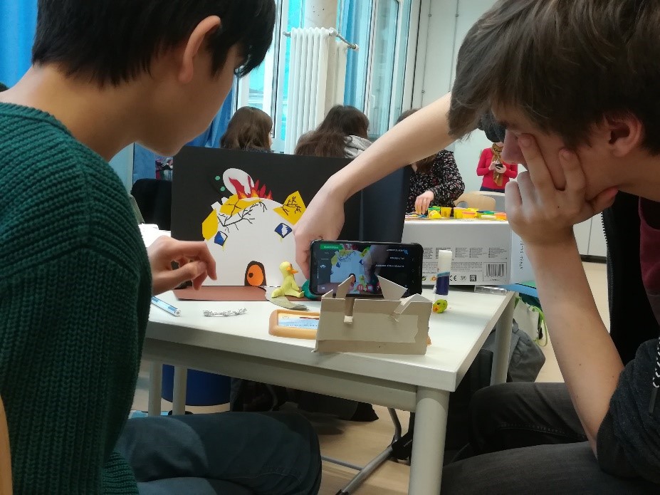 Nach einer gut gelaunten Kennenlernrunde präsentierten die Lehrerinnen die bereits im Vorfeld entstandenen Arbeitsergebnisse, die zum Thema des Austauschs „Unsere Zukunft“ entstanden waren. Die deutschen und französischen Schüler hatten ihre Vorstellungen darüber, wie sich die beiden Länder Frankreich und Deutschland bis zum Jahr 2049 verändern könnten, sprachlich und bildlich festgehalten. Danach wurden Videoausschnitte mit positiven und negativen Prognosen für unsere Zukunft geschaut. Bei einem Brainstorming überlegte Gruppe, welche Entwicklungen in den Bereichen Politik, Wirtschaft, Medien, Technik, Künstliche Intelligenz und Umwelt denkbar wären. An diese Überlegungen schloss sich unser kreatives Projekt für die Woche an: Jedes Austauschpaar erhielt die Aufgabe, ein Stopmotion-Video zu entwickeln, in dem positive oder negativ Zukunftsvorstellungen veranschaulicht werden sollten.
