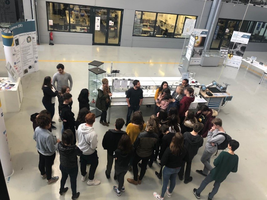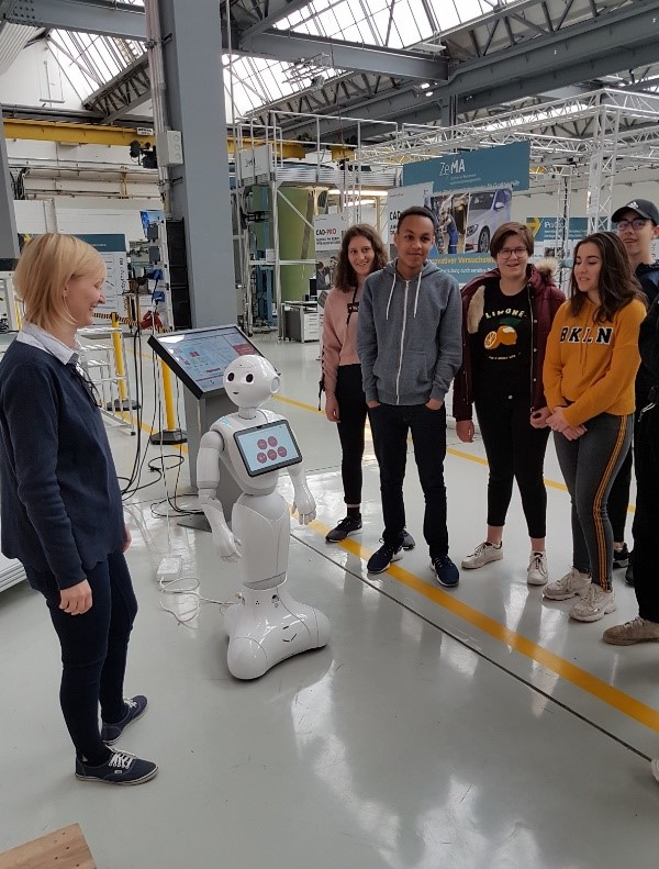 Als Abschluss unserer Austauschwoche machten wir am Freitag einen Ausflug ins Zentrum für Mechatronik und Automatisierungstechnik (ZEMA Saarbrücken) am Eschberg. Passend zu unserem Thema wurde uns hier anschaulich die Arbeit des Forschungszentrums in den Bereichen „Zusammenspiel Mensch & Roboter“, „Neue Materialien“ und „3D-Druck“ in der Industrie erklärt und vorgeführt. Nach dem Mittagessen in der Cafeteria führten alle Gruppen ihr Zukunftsvideo vor. Nach einer Abstimmung über den besten Film und einer Preisverleihung wurde die Stimmung allmählich emotional – die Schüler und die Lehrerinnen verabschiedeten sich mit persönlichen Grüßen voneinander. Diese Grüße wurden auf einen Pappteller, der am Rücken jedes einzelnen Austauschteilnehmers klebte, notiert. Beim letztendlichen Abschied auf dem Schulhof war offensichtlich, dass die Gruppe in der Woche gut zusammengewachsen war. Es flossen viele Tränen und einige Paare schmiedeten bereits Pläne, sich noch vor dem geplanten Rückaustausch auf eigene Faust zu treffen. Somit freuen wir uns sehr auf unsere Fahrt nach Thionville, die Anfang Herbst stattfinden wird!