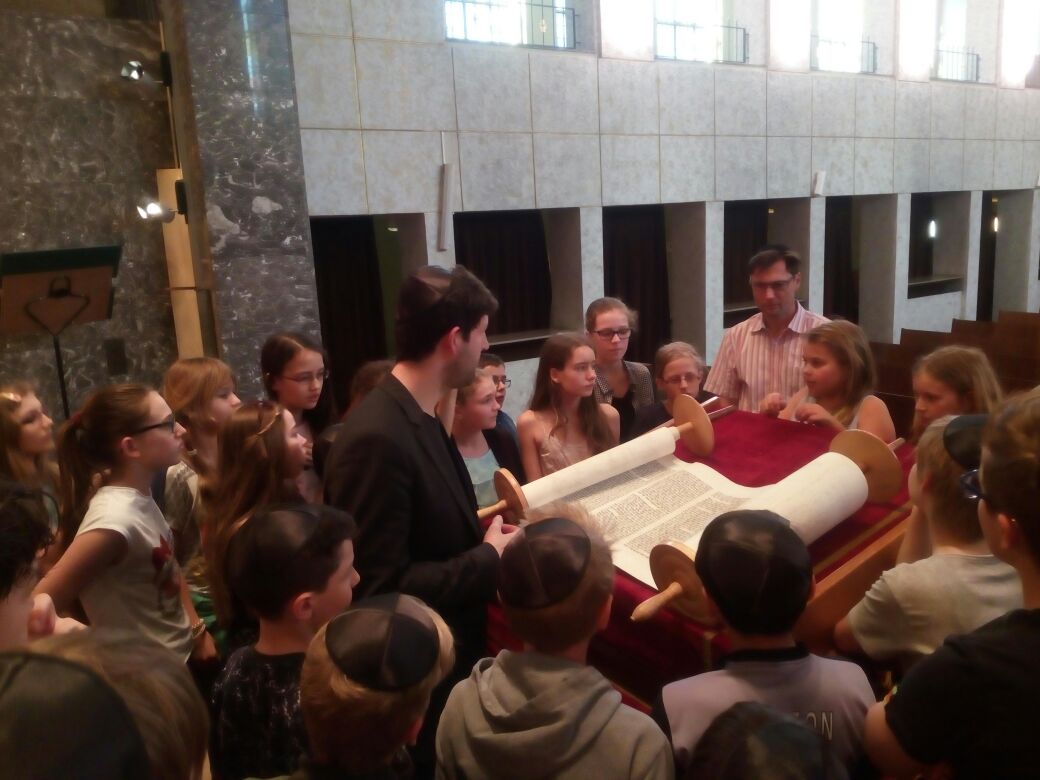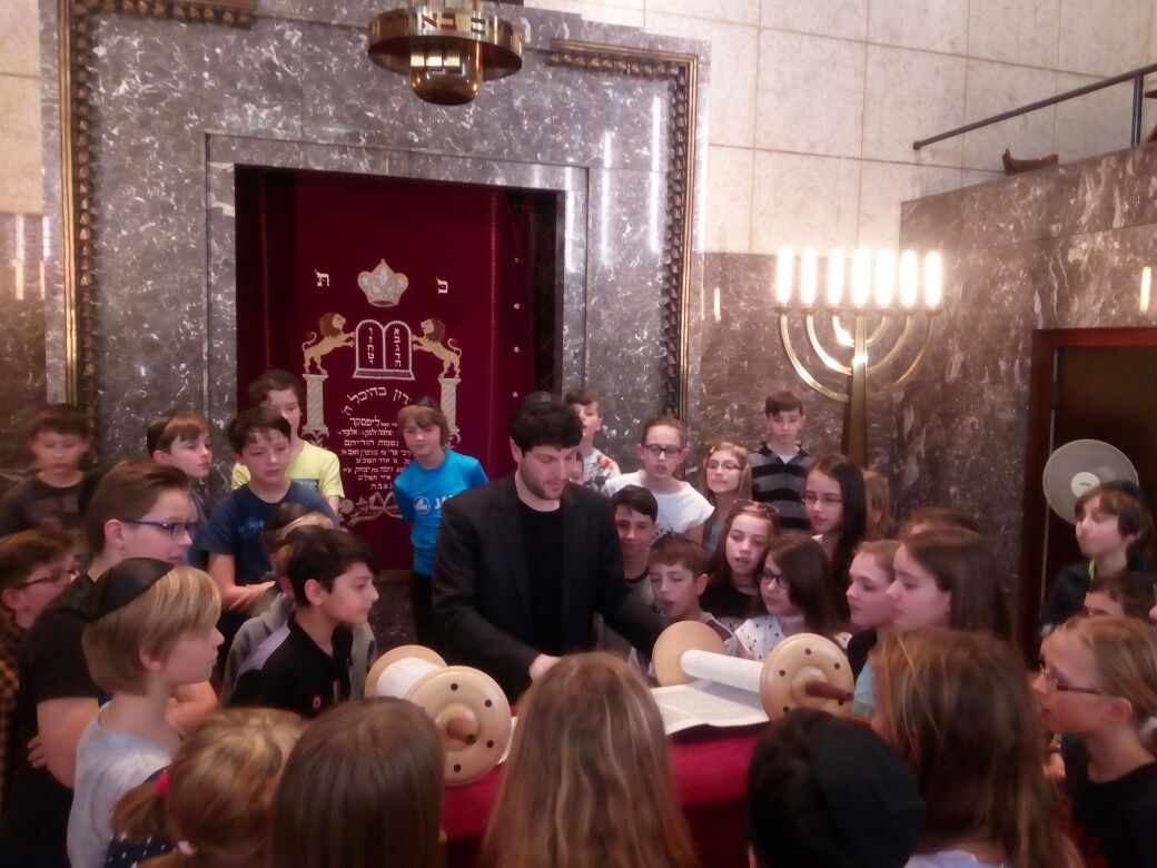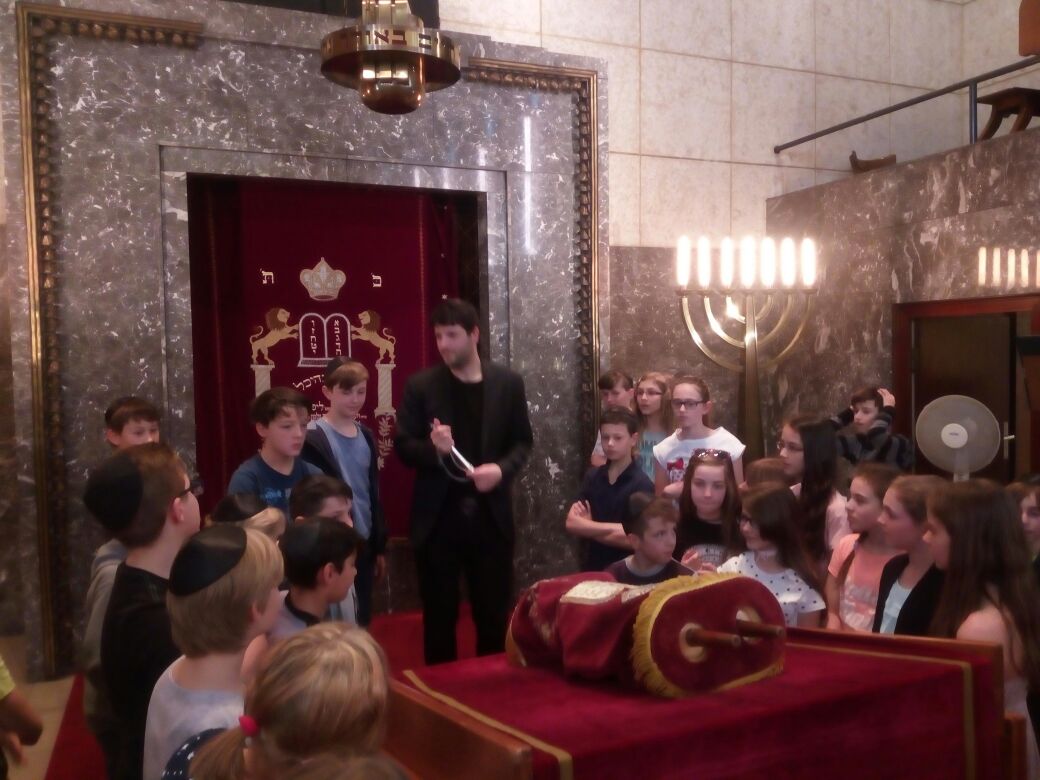 Am Freitag, den 20.04.2018 besuchte der katholische Teil der Schülerinnen und Schüler der Klassenstufe 5 gemeinsam mit ihren Religionslehrern Frau Simon und Herrn Blees die Saarbrücker Synagoge. Die Führung durch den Kantor Benjamin Chait war der gelungene Höhepunkt der Unterrichtsreihe zum Judentum, da einige der Themen, die bereits im Unterricht angeklungen waren, vertieft werden konnten. Die Schülerinnen und Schüler staunten über den respektvollen Umgang mit den wertvollen Tora-Rollen und es entwickelte sich ein lebhaftes Gespräch über die Regeln und Glaubensvorstellungen im Judentum.