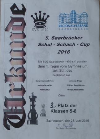 Am 28. Juni hat unsere – nach einem Jahr Pause – “wiederbelebte” Schulschach AG am 5. Saarbrücker Schul-Schach–Cup 2016 teilgenommen. Mit 6 Schülerinnen und Schülern haben wir im Deutsch-Französischen Gymnasium den 3. Platz der Klassen 5-8 belegt und wurden für diese beachtliche Leistung mit einer Urkunde und Bronzemedaillen geehrt. Die teilnehmenden Schülerinnen und Schüler hatten jede Menge Spaß und sammelten wertvolle Wettkampferfahrung bei dem gut organisierten Turnier. Wir gratulieren den 6 teilnehmenden Fünftklässlern, die das vierstündige Turnier erfolgreich absolviert haben – und hoffen, dass die Schach-AG auch zukünftig erfolgreich arbeiten wird.