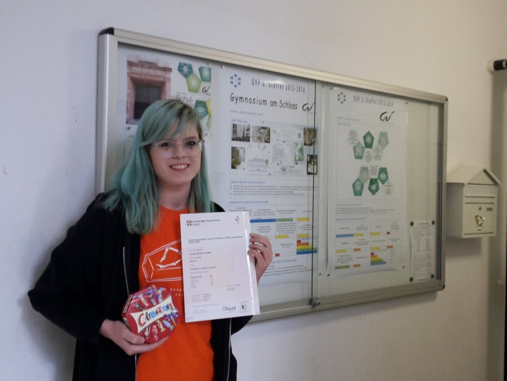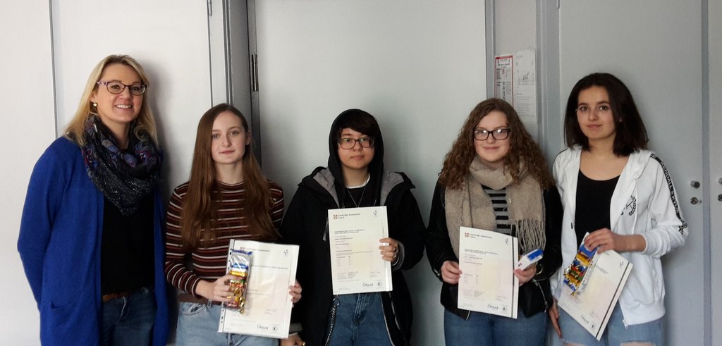 Wir gratulieren ganz herzlich den Schülerinnen Charlotte Hanzal, Anna Levchanovskaya,Heloise Scharrer und Lilly Welter aus der 9a sowie Helene Schmidt und Désirée Pfeifer aus dem 12. Jahrgang, die ihre Cambridge-Prüfung im Schuljahr 2018/19 erfolgreich absolviert haben. Dabei wurden u.a. hervorragende Ergebnisse erzielt, wie z.B. die Niveaustufen C1 und C2 durch die Schülerinnen des 12. Jahrgangs und das Niveau B1 einiger Schülerinnen aus der 9. Klasse. Teils wurde sogar mit einem „Pass with Distinction“ ein B2, die höhere Niveaustufe als ursprünglich angestrebt, erreicht.