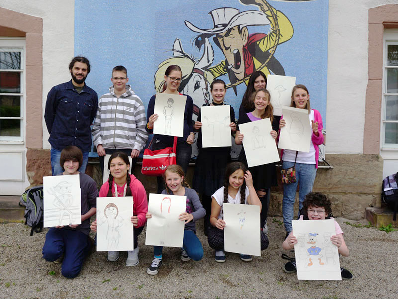 Anschließend gab es in einem hübschen kleinen Seminarraum einen Workshop. Dabei sollte man eine ausgedachte oder eine vorgegebene Comicfigur zeichnen, und zwar auf ein großes, festes Papier, damit sie uns als Grundlage für unsere späteren Comics dienen kann. Zum Schluss wurden noch Fotos mit allen Schülern und ihren Kunstwerken gemacht und es wurde sich verabschiedet. Auf der anschließenden Heimreise konnten wir uns über den Tag austauschen. Trotz des Altersunterschiedes (5. -9. Klassenstufe!) hat jeder, wenn auch mehr oder weniger, etwas Neues dazu gelernt. Ein Dankeschön geht an Frau Raber , die uns sehr freundlich viel Wissen übermitteln konnte. Wir alle freuen uns auf noch ein paar schöne Stunden in der Comic-AG, bis dieses Schuljahr zu Ende geht!