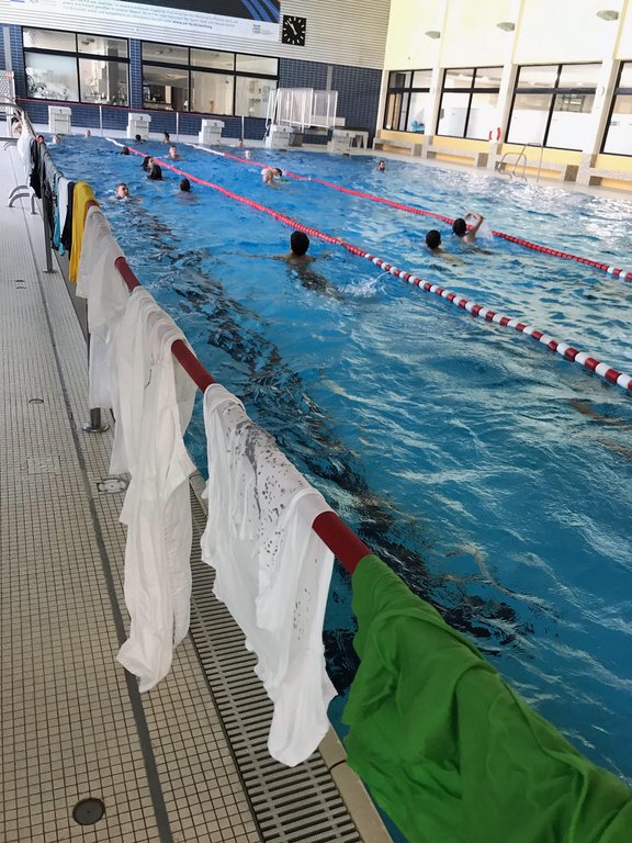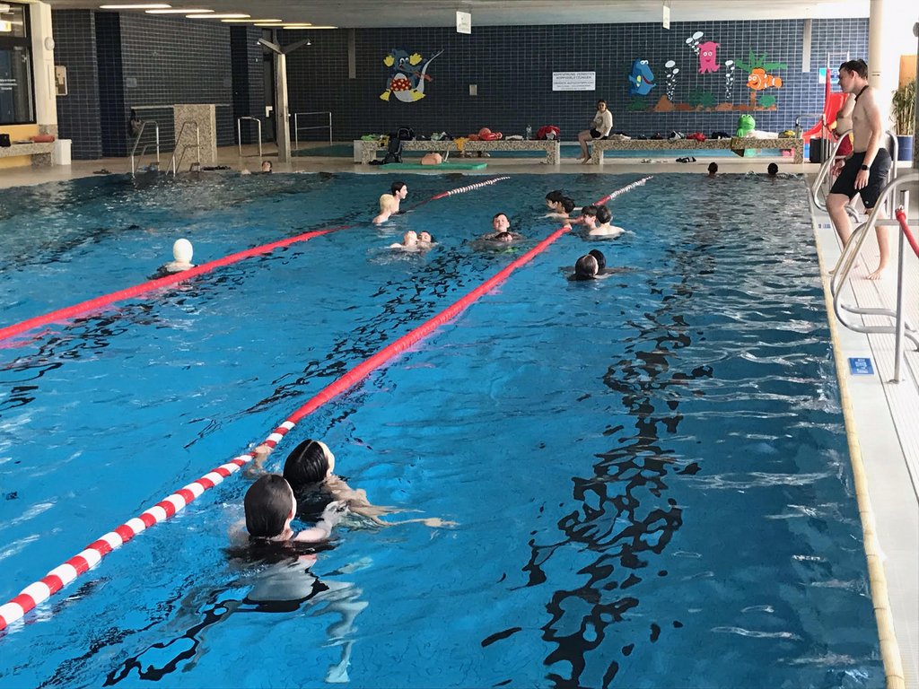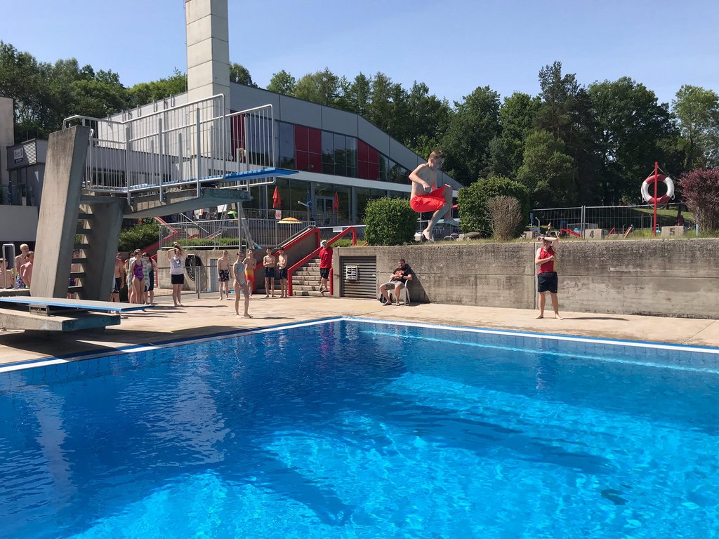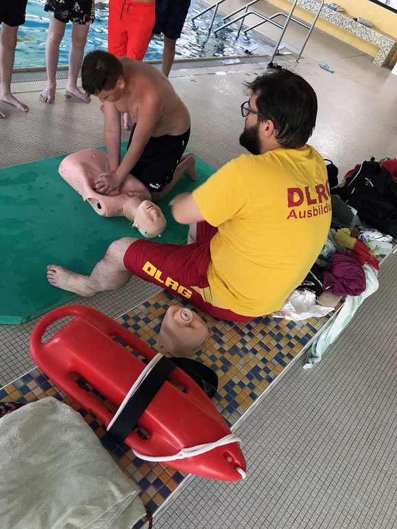 Am 17.06. fand für die Klasse 7d ein DLRG/Schwimmtag statt. Da der Schwimmunterricht in Klasse 6 leider der Pandemie zum Opfer fiel, sollte dieser Tag zumindest ein bisschen entschädigen. Im Fechinger Kombibad wurden der Klasse von Oberstufenschüler Aaron und seinem DLRG Kollegen Christoph die Basics der Lebensrettung vermittelt. So lernten sie neben dem Achselschleppgriff, dem Rettungsballwurf und dem Anlandbringen auch die lebensrettende Herzlungen-Wiederbelebung. Außerdem durften die Schüler*innen auch mal erfahren, wie schwer es ist, mit Kleidung zu schwimmen. Da das Wetter mit 34 Grad zu gut war, die ganze Zeit nur im Hallenbad zu verbringen, wurde natürlich auch noch genügend Freizeit geboten, um sich im Freibad zu vergnügen. Zum guten Schluss konnten 7 Schüler*innen noch ihr Bronze (Freischwimmer) Abzeichen absolvieren. Alles es in Allem ein lehrreicher und spaßgefüllter Schultag im Wasser!