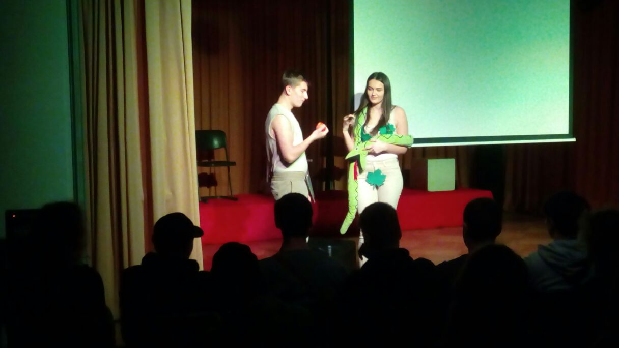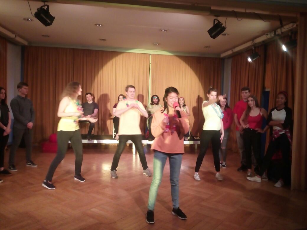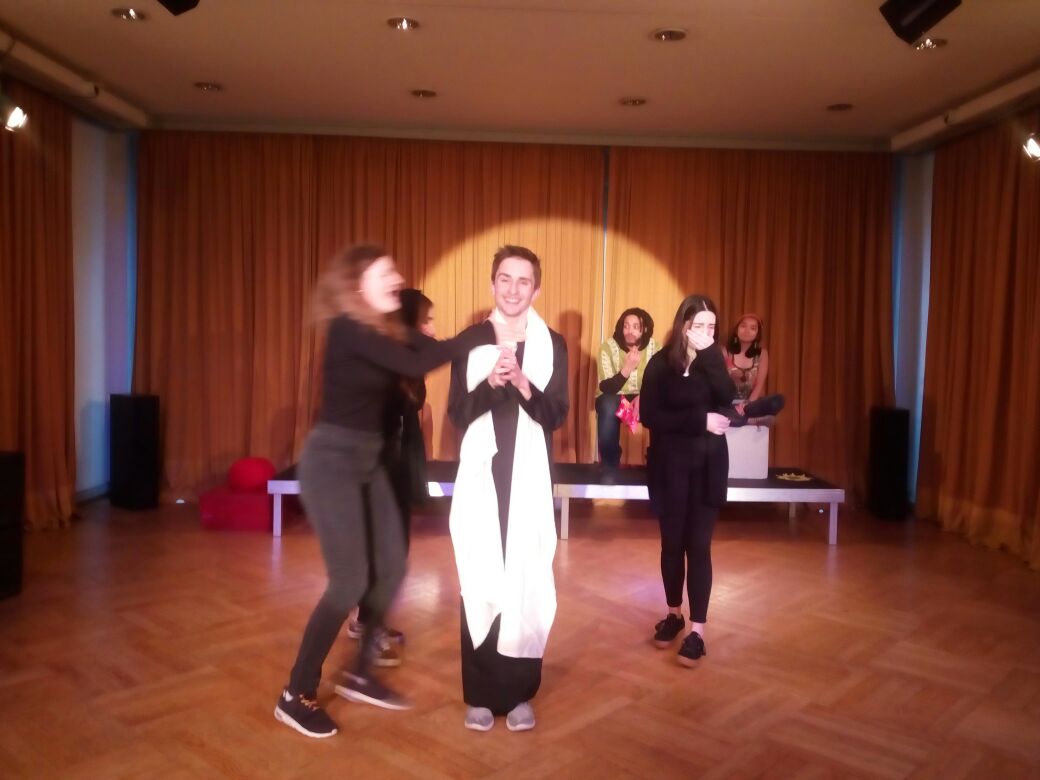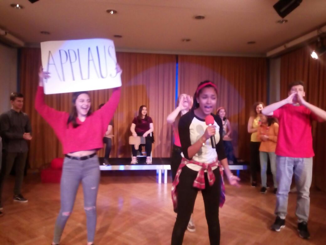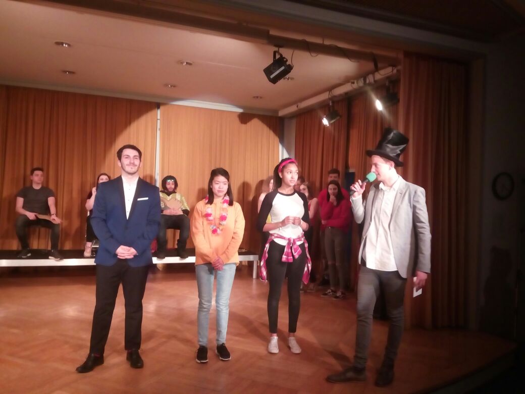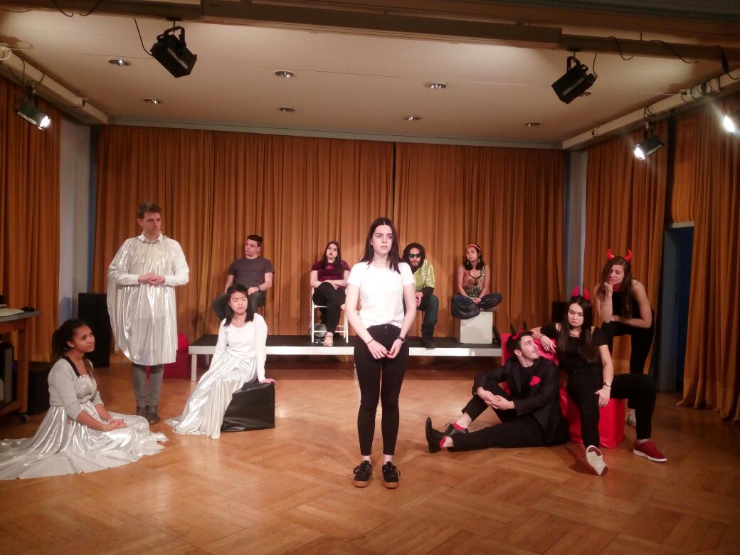 Am Sonntag, den 04.03.2018 wurde unsere Aula Schauplatz eines besonderen Spektakels. 17 „Menschen“ und 4 „Götter und Göttinnen“ stellten gemeinsam auf der Bühne die wirklich wichtigen Fragen, wie z.B. „Was würde ich tun, wenn ich göttliche Fähigkeiten hätte?“, „Höre ich in Dilemma-Situationen lieber auf die Engelchen oder die Teufelchen in meinem Kopf“, „Wäre unser Planet ohne Menschen nicht vielleicht besser dran?“ oder auch „Wieviel Chili verträgt der optimale Döner?“. Insgesamt ein kurzweiliger, ca. 40-minütiger Schauspiel-Spaß, der von den Zuschauerinnen und Zuschauern mit viel Applaus belohnt wurde.