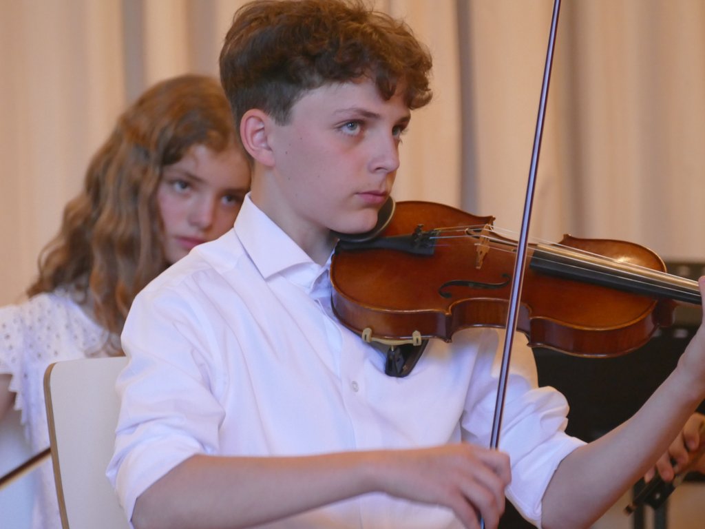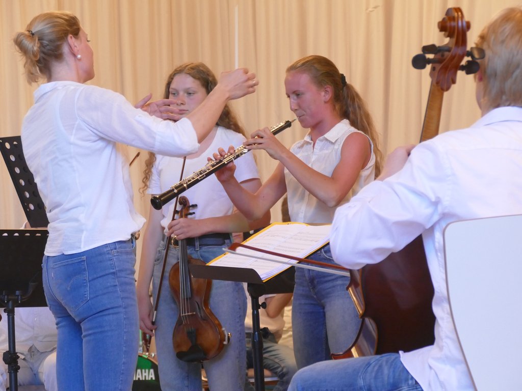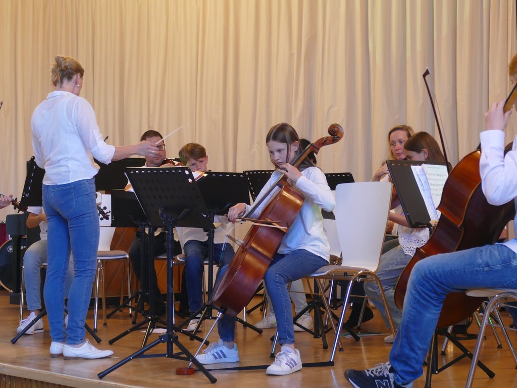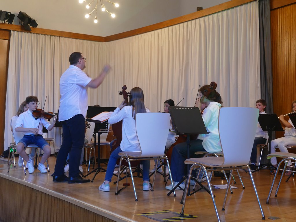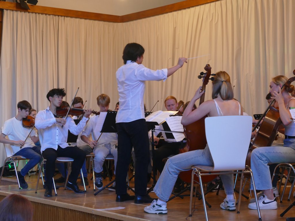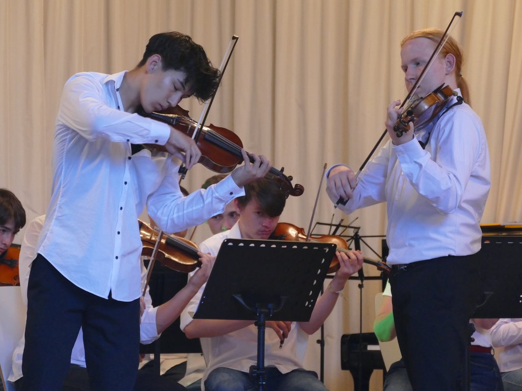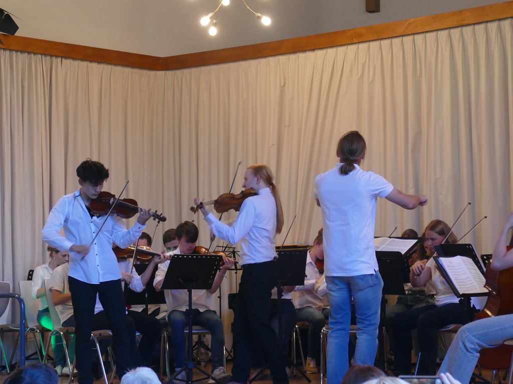 Ebenfalls ein roter Faden, die vielen kleineren und großen Sololeistungen, eingeleitet von Aurelia Kalla und Paul Gurti, fortgesetzt von Konstantyn Maslov (Oboe), Mathilde Kemmerer (Oboe), Rahel Missal (Violine), Jovis Kaliunas (Violine), Thomas Anstett (Cello), Eleana Adams (Flöte). Ein atemberaubender Höhepunkt war hier der anspruchsvolle Csárdás des italienischen Komponisten Vittorio Monti mit seinen getragenen Abschnitten und den furiosen Temposteigerungen, Martin Ettrich und Moritz Schumacher (Violine) faszinierten das Publikum, bewiesen technisch und mit beeindruckendem Ton schon Profi-Niveau.