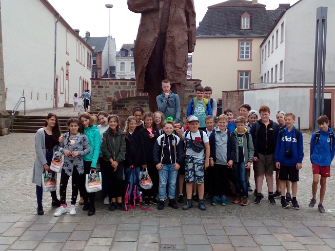 … und ganz viel Auslauf auf dem herbergseigenen Gelände mit angelegten Chill-out-Areas, einer Schatzsuche, die immerhin zur Hebung eines Tresors führte – das erwartete die Klasse 6b2 auf ihrem Klassenausflug nach Weiskirchen. Reisezeit war der 22. bis 24. Mai 2018. Im Bild ist die Reisegruppe vor dem Karl Marx-Denkmal (das wiederum nur die Unterseite des ehrenwerten Trierer Stadtbürgers zeigt) zu sehen.