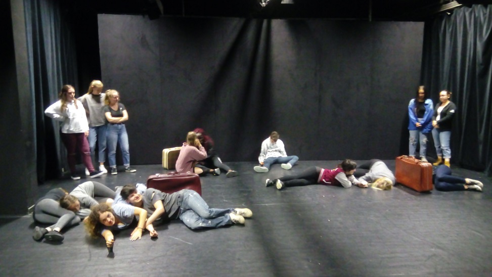 Der Darstellendes Spiel-Kurs 11-8 von Herrn Hoster präsentierte am Abschlusstag der Schultheatertage Saar (Freitag, 18.05.2018) die mit Bob Ziegenbalg vom Theater Überzwerg gemeinsam einstudierte Eigenproduktion “Hoffnung?!” auf der Bühne der Sparte 4. Die 15-minütige Collage zum Themenkomplex “Flucht” begeisterte die jugendlichen Zuschauer anderer Schulen mit ihren Spielleitern und auch Herrn Horst Busch, Chefdramaturg und Künstlerischer Leiter Schauspiel am Saarländischen Staatstheater, dem die Präsentation der Schlossschüler sehr gut gefiel. Die Szenencollage soll ausgebaut werden, um dann im kommenden Schuljahr noch einmal präsentiert zu werden. Ansonsten verbrachte die Schauspielgruppe des Gymnasiums am Schloss einen spannenden Theatertag mit workshops, dem Betrachten anderer Schülerproduktionen und viel Spaß gemeinsam am Theater Überzwerg und der Sparte 4.