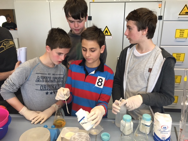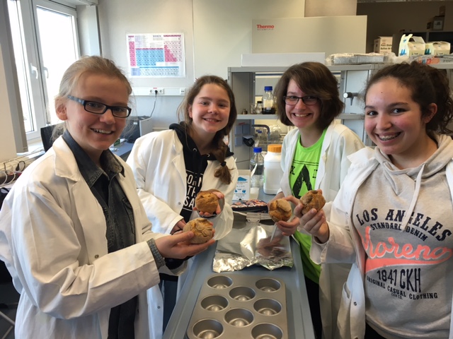 Im mikrobiologischen Zweig backten wir Brot: Zuerst wogen wir die Zutaten ab und gaben die Hefe, die mit Wasser vermischt war, in eine Zentrifuge, die mit 9000 Umdrehungen pro Minute die Hefe vom Wasser trennte. Dann wurden alle abgewogenen Zutaten in einen Topf gegeben und in einen Brutschrank gestellt. Als der Teig fertig war, kneteten wir ihn und teilten den Teig in 4 Muffin-Formen auf und stellten diese wiederum in den Ofen. Das fertig gebackene Brot packten wir dann in Alufolie, um es am Nachmittag zu essen.