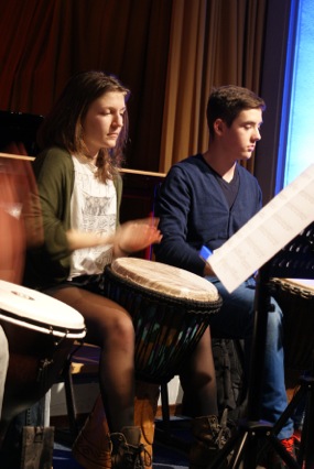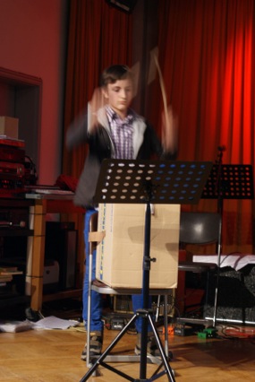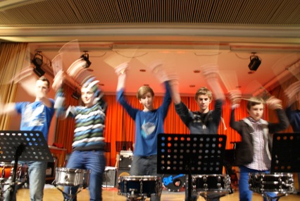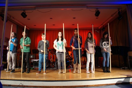 Diese neue Farbe in unserem Musik- und AG-Angebot haben wir Fedor Podranski zu verdanken, der nun im zweiten Jahr bei uns an der Schule ist und die Percussion-AG Groovin’ Elements ins Leben gerufen hat, die sich nicht nur damit begnügt, etwas fürs Ohr zu bieten, sondern auch das Auge erfreut. Sei es, dass mit kaputten Besen gekämpft, alte nicht mehr brauchbare Umzugskartons beklopft oder mit dem Kochlöffel auf den Tisch gehauen wurde. Letzteres war Teil einer sehr beeindruckenden Performance zur “Kleine[n] Tischmusik” von Manfred “Amadeus” Menke.