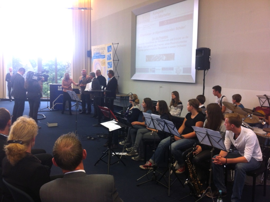 Gerne werden unsere Schulbands engagiert, um besondere Veranstaltungen zu umrahmen. Im noch jungen Schuljahr haben wir schon bei zwei Veranstaltungen mitgewirkt - und die nächsten stehen schon an! Die Bigband Blue Date präsentierte sich schon Ende September sehr gut eingespielt bei einer Kooperations-Veranstaltung der IHK und des Vereins Pro Ehrenamt, bei der Firmen für ihr besonderes soziales Engagement ausgezeichnet wurden. Unter der Schirmherrschaft von Minister Heiko Maas wurde unter anderem das Musikhaus Knopp für seinen Einsatz bei der Betreuung der Bläserklassen der Marienschule geehrt.