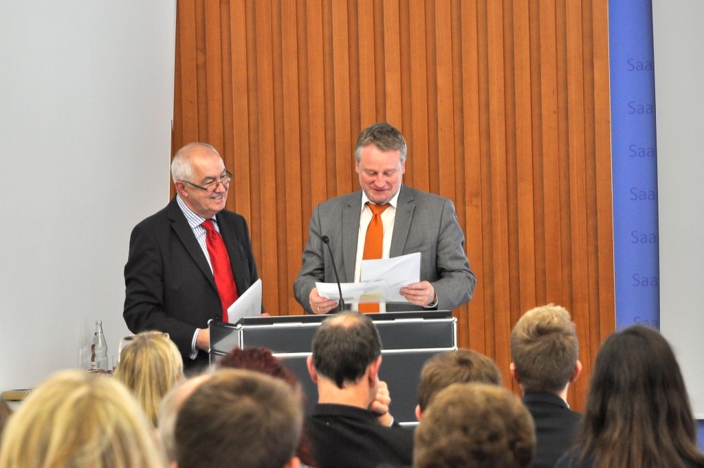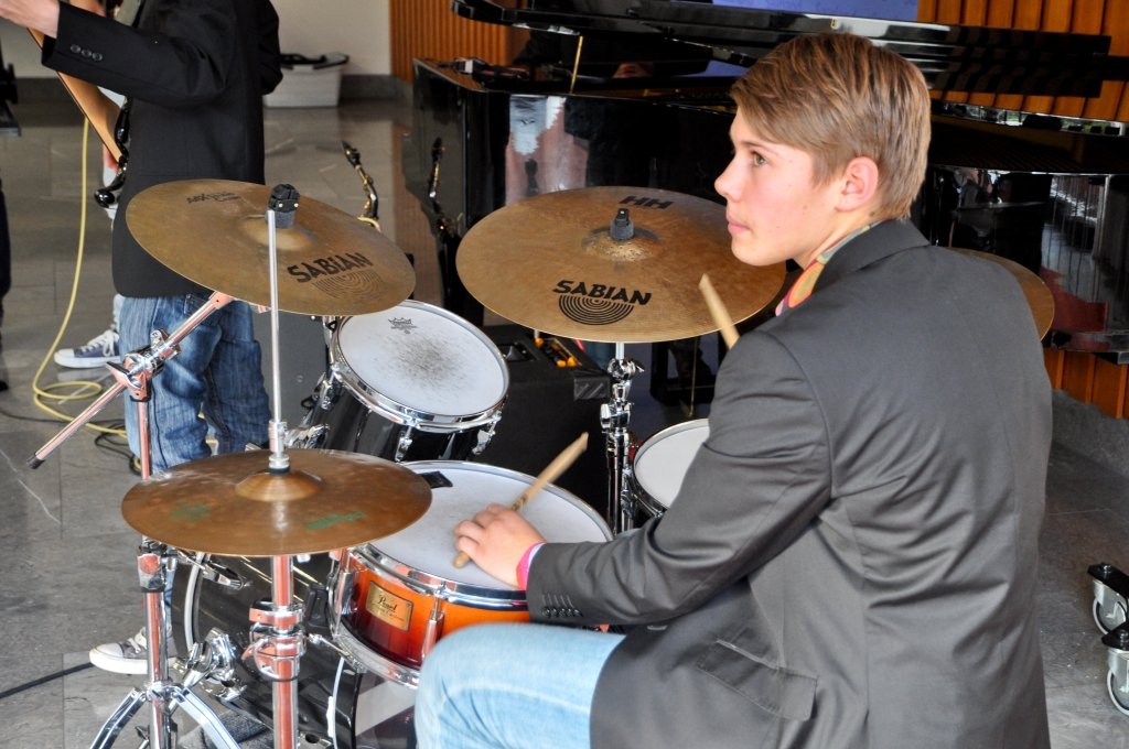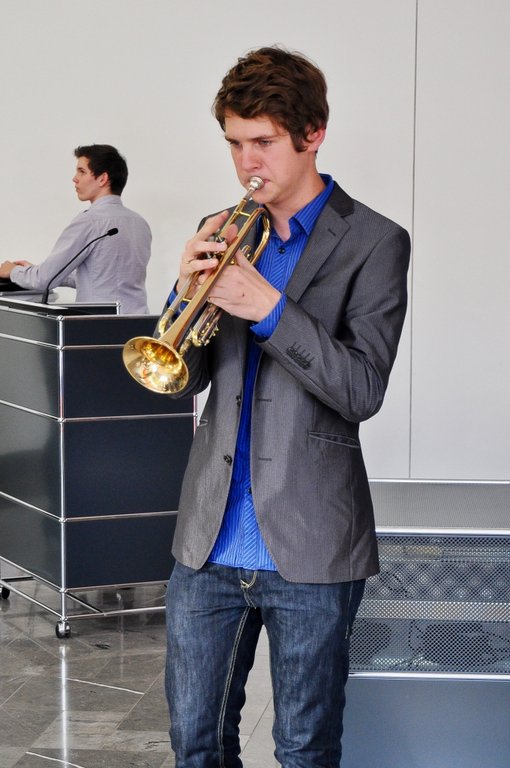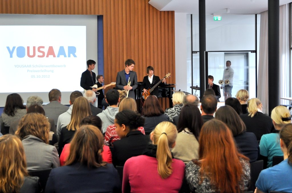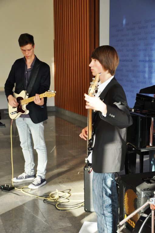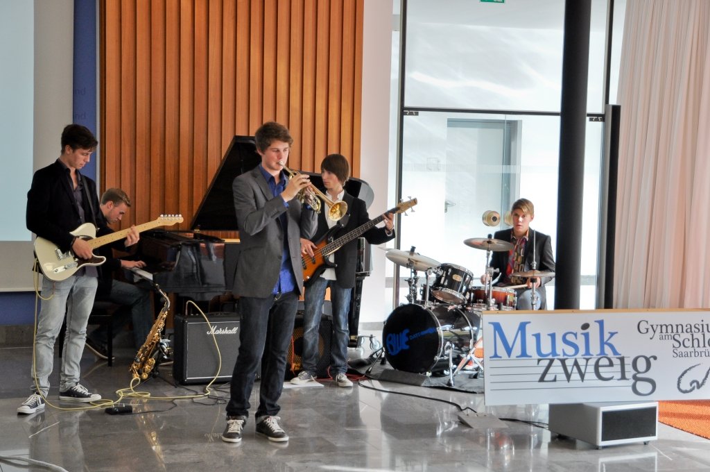Unsere noch junge Jazz-Combo durfte dann eine Woche später ran. In der Staatskanzlei fand im Beisein von Bildungsminister Ulrich Commerçon die Siegerehrung eines Fremdsprachenwettbewerbs des Deutsch-Amerikanischen Instituts statt. Trotz der anstrengenden Projektwoche an unserer Schule fanden die 5 Musiker der Combo (Lukas Schild/as, Jan Schröder/tp, Sebastian Langguth/g, Lars Möckel/b, Jonathan Ernst/dr) Zeit, sich auf ihren ersten öffentlichen Auftritt vorzubereiten. Auch hier - von allen Seiten ein großes Lob!