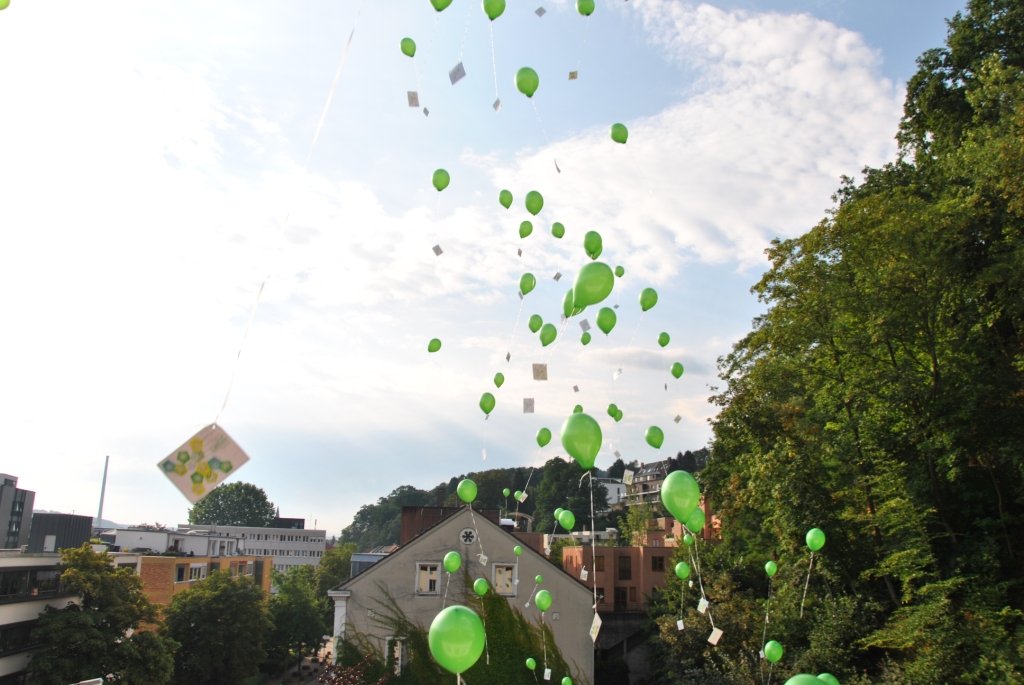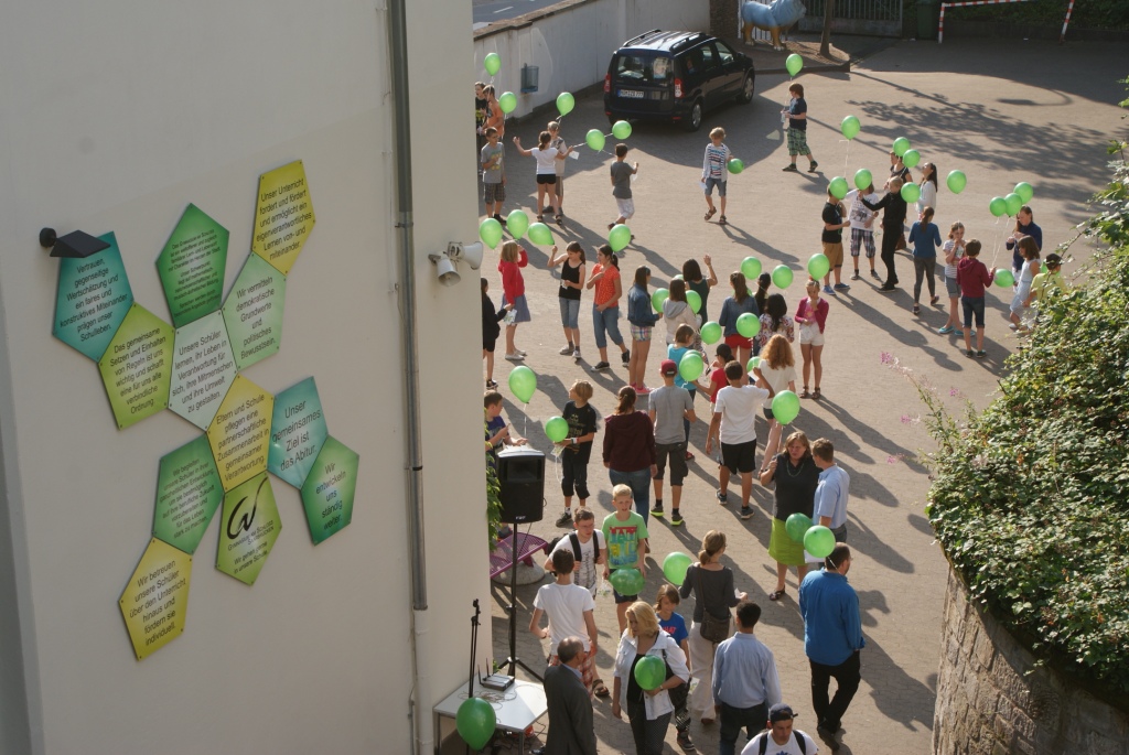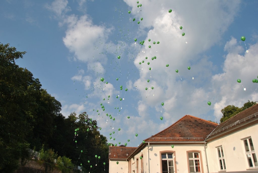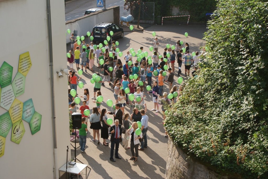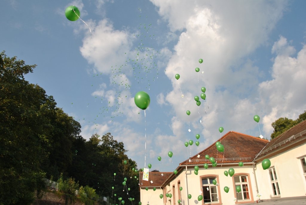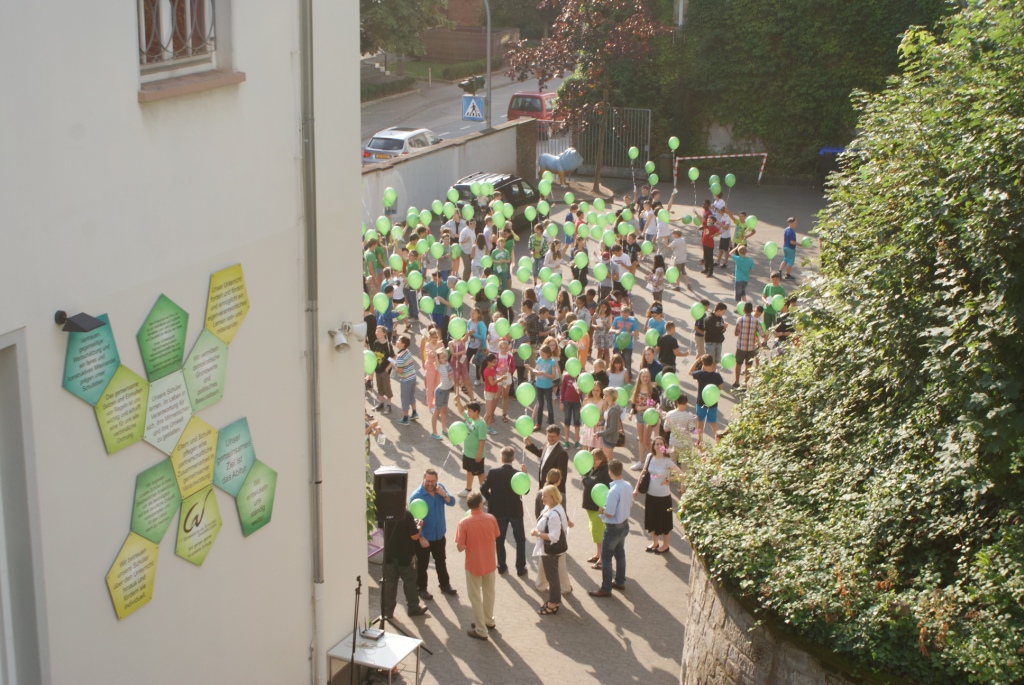 Der Festakt, dessen Planung die Schulentwicklungsgruppe Lehrer/Eltern/Schüler des Schlossgymnasiums übernommen hatte, nahm seinen Lauf: Auf ein abermals verabredetes Signal hin erhoben sich unzählige Luftballons in die Lüfte. Alle drei Schulhöfe des Gymnasiums schienen sich in grüner Farbe aufzulösen und unter Jubelrufen gen Himmel zu schweben.