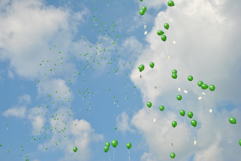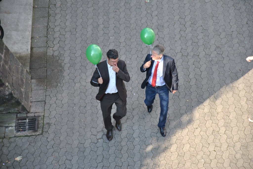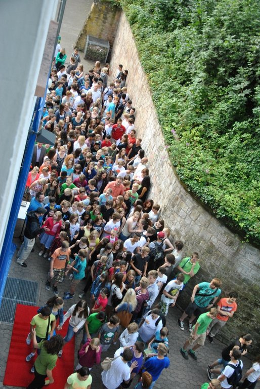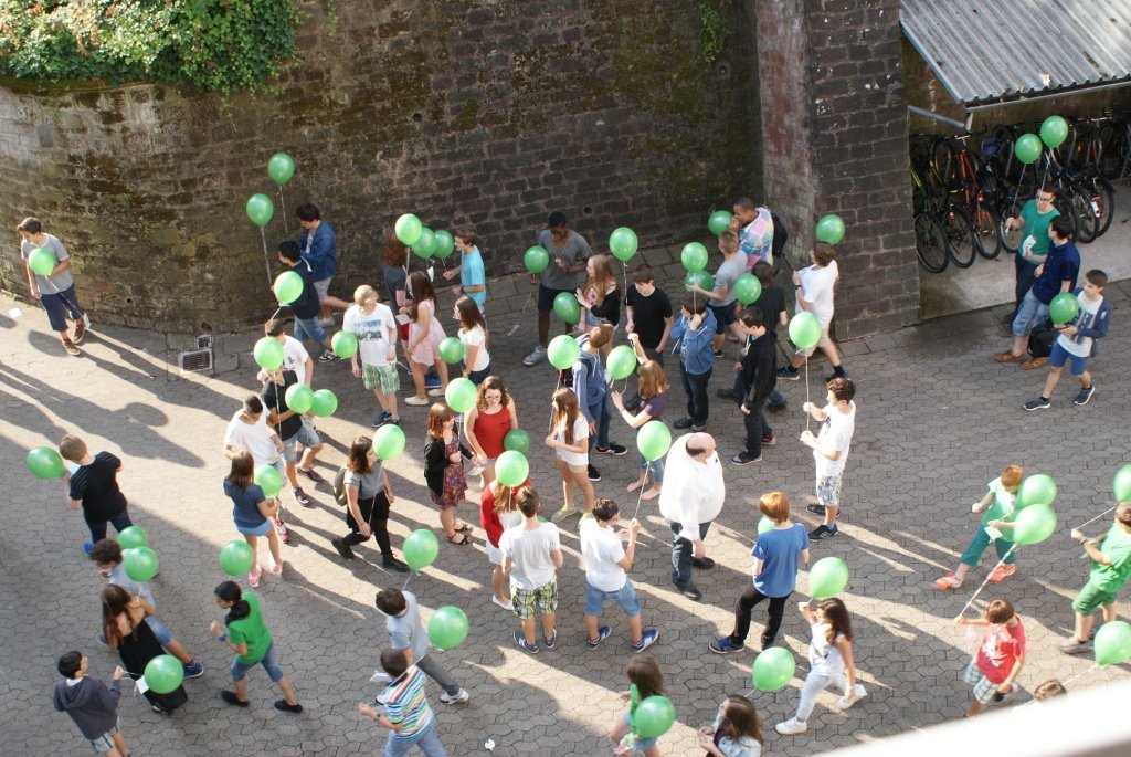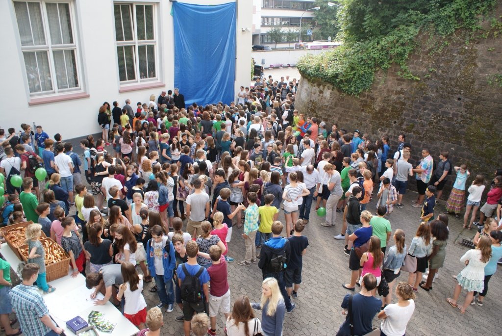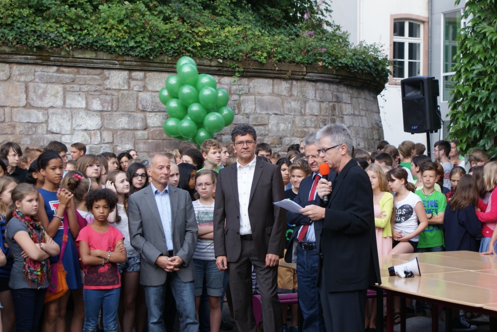 Der Festakt, dessen Planung die Schulentwicklungsgruppe Lehrer/Eltern/Schüler des Schlossgymnasiums übernommen hatte, nahm seinen Lauf: Auf ein abermals verabredetes Signal hin erhoben sich unzählige Luftballons in die Lüfte. Alle drei Schulhöfe des Gymnasiums schienen sich in grüner Farbe aufzulösen und unter Jubelrufen gen Himmel zu schweben.