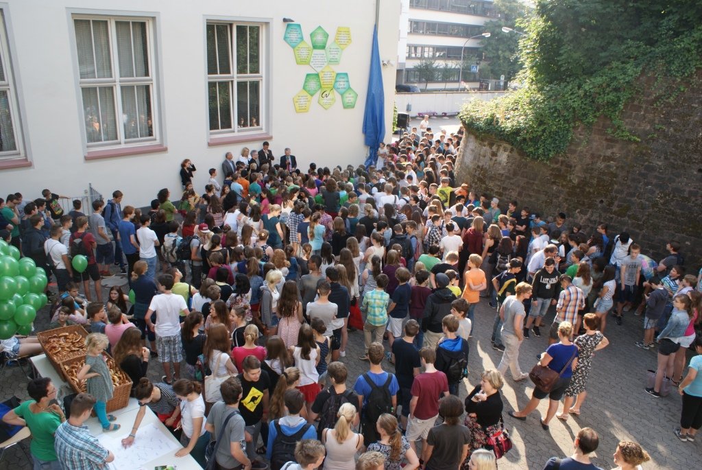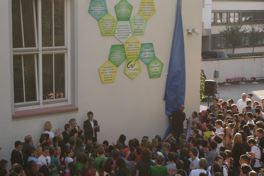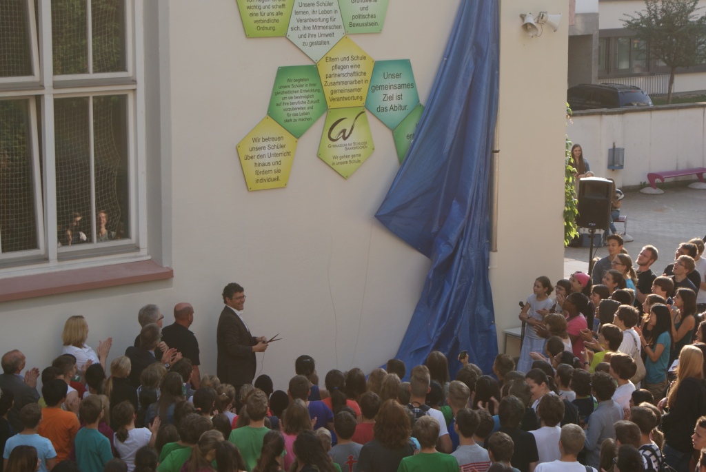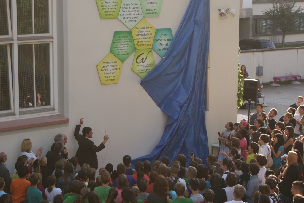 Saarbrücken, 25. Juli 2014. 6:45 Uhr: Hektisches Treiben in den Gängen des Schlossgymnasiums. Schüler und Lehrkräfte bewegen sich laufend durch die Gänge. Räume füllen sich mit voluminösen Farbklecksen. 8:00 Uhr: Schüler versammeln sich im Freien, vor dem Schulgebäude. Musik erklingt. Dann gespannte Stille. Man sieht die Schüler und das Kollegium des Gymnasiums am Schloss. Der Schulleiter Peter Geckeis begrüßt darüber hinaus den Regionalverbandsdirektor Peter Gillo und den Leiter des Fachbereichs für Soziales, Gesundheit und Bildung, Arnold Jungmann, die Fachdienstleiterin des Schulverwaltungsamtes, Kerstin Theobald, sowie Kerstin Blum aus dem Bauamt des Regionalverbandes Saarbrücken und Ingwardt Tauchert, den Vorsitzenden des Förderkreises. Erhebendes scheint im Schwange zu sein. Die Menschenmenge verlagert wie auf ein geheimes Zeichen hin ihre Position. Nun erheben ausgewählte Redner ihr Wort. Zunächst spricht der Regionalverbandsdirektor Peter Gillo über die Bedeutung einer homogenen Schulgemeinschaft als Bedingung dafür, dass Schule gelingt. Ihm folgt der Vorsitzende des Förderkreises, Ingwardt Tauchert, der ebenfalls seiner Begeisterung Ausdruck verleiht, dass unermüdlich und in manch zusätzlicher Stunde die Schulgemeinschaft sich zusammengefunden hat, um über ihr Leben und Arbeiten in der Schule nachzudenken. Schließlich meldet sich die Schülerin Jule Schlimmer (10a1) zu Wort; sie verweist auf die organisatorischen und baulichen Veränderungen, die im noch laufenden Schuljahr 2013/14 anstanden und die allesamt darauf abzielen, die bestehende Schulgemeinschaft noch lebendiger zu gestalten. Und dann ist es soweit: Peter Geckeis und Peter Gillo setzen mit dem Schnitt einer Schere eine ausgeklügelte Apparatur in Gang. Ein blauer Vorhang fällt raschelnd zu Boden und zum Vorschein kommt ein kunstvoll arrangiertes Ensemble von insgesamt zwölf 5-eckigen Einzeltafeln, deren Layout von Martina Sonnenrein (Mitglied der Schulentwicklungsgruppe Lehrer/Eltern/Schüler) stammt: das Leitbild des Schlossgymnasiums. Dabei handelt es sich um zwölf essentielle Leitsätze der Schulgemeinschaft, die gemeinsam aufgestellt wurden und Lehrer sowie Schüler, aber auch alle weiteren Besucher des Gymnasiums, zu ständiger Reflexion einladen: Vertrauen und Wertschätzung des Anderen, individuelle Förderung und die ständige Bereitschaft, sich weiterzuentwickeln.