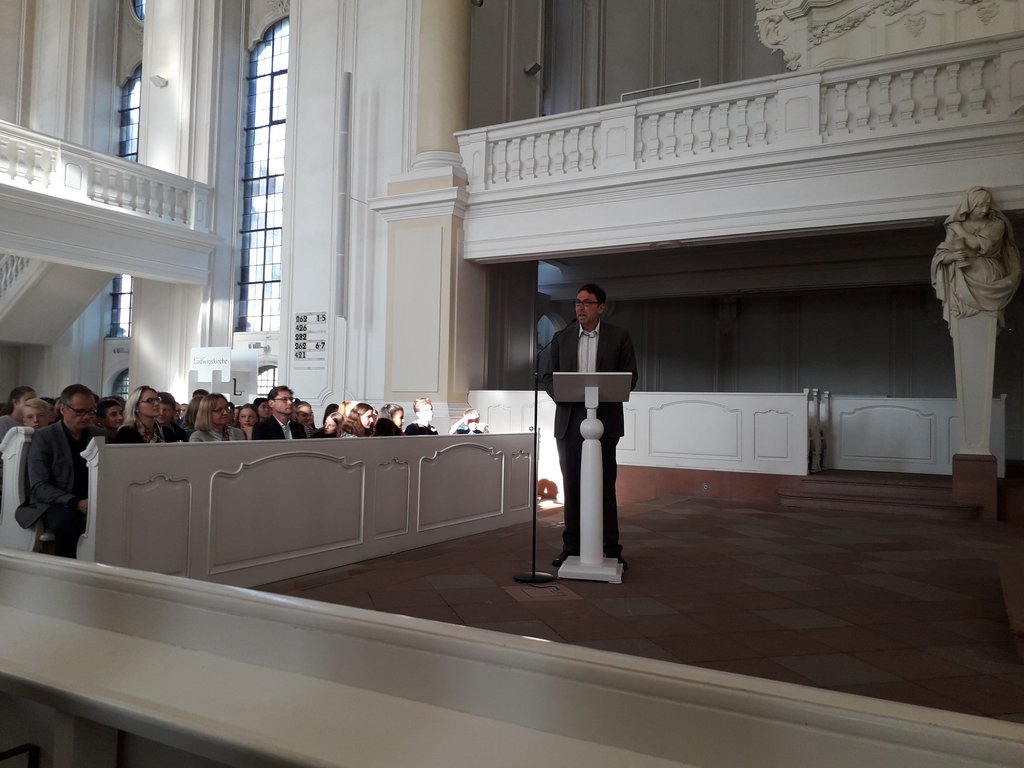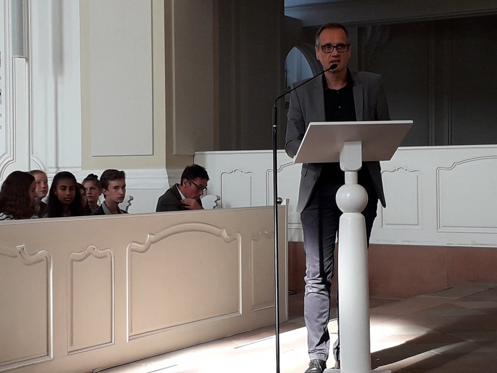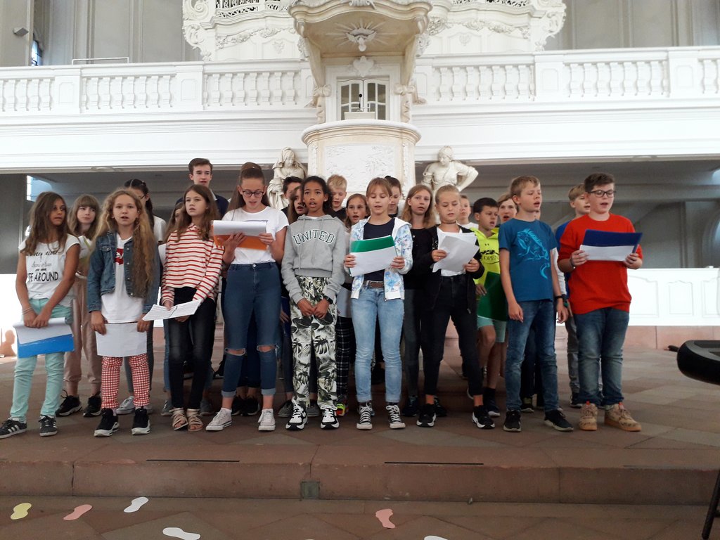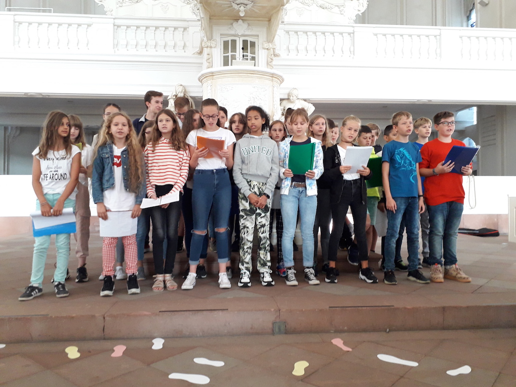 Der Hintergrund der Veranstaltung in der Ludwigskirche ist, dass alle Schüler, insbesondere die neu aufgenommenen Fünftklässler, gemeinsam starten sollen und dann durch die am gleichen Ort stattfindende Abiturfeier acht Jahre später wieder von der Schule verabschiedet werden. Herr Dr. Dr. Hild gestaltete die zweistündige Veranstaltung gemeinsam mit Frau Behr und Schülerinnen und Schülern unserer Schule. Das Motto war „Fußspuren“ und „Wege“, die man hinterlässt und die man geht in seiner Schulzeit, was durch die auf dem Boden ausgelegten Fußabdrücke aus Pappe jedem Besucher bereits beim Betreten der Ludwigskirche deutlich gemacht wurde. Umrahmt von hörenswerten musikalischen und choralen Beiträgen fand unser neuer Schulleiter Herr Hofmann herzliche Worte zu seinem Einstieg als neuer Schulleiter und begrüßte seine Schülerschaft, das Kollegium, anwesende Eltern und die gesamte Schulgemeinschaft des Gymnasiums am Schloss.