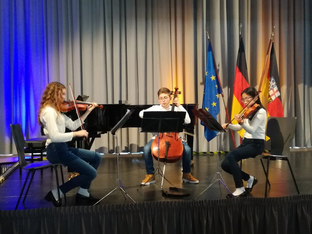 Beschwingt eröffnete das Trio mit Aaron, Rahel und Yasmin den Abend, sehr gewürdigt von Peter Gillo, der betonte, dass man sich bei solch hervorragender Leistung keine Sorge um den musikalischen Nachwuchs machen müsste. Karoline Metzger und Lena Strothmann folgten darauf mit dem „Ständchen“ von Schubert, als Höhepunkt präsentierte Karoline Metzger das Solostück „La Leggerezza“ von Franz Liszt – (auswendig). Nachdem alle neuen Bürger ihre Einbürgerungsurkunde erhalten und den Eid geschworen hatten (einer der Schüler bemerkte, dass es doch viel schöner wäre, wenn jeder sich einen Satz aussuchen könnte, statt immer den gleichen vorzutragen), stimmten Klavier und Cello die Nationalhymne an. Der Abend endete noch einmal mit dem Trio der SchülerInnen aus Klasse 6a und 7a. Den jungen MusikerInnen wurde mit großem Applaus für ihr Engagement gedankt.