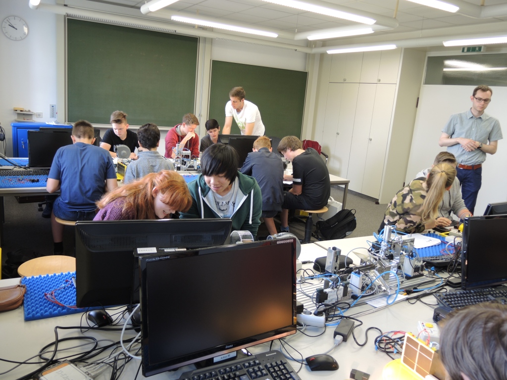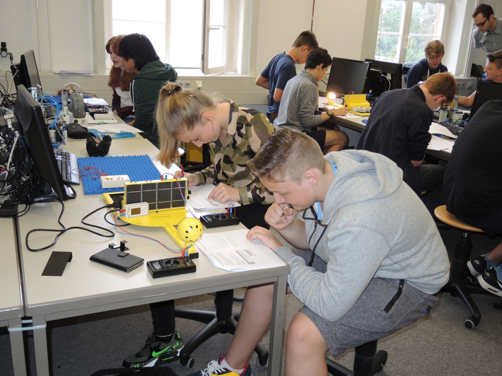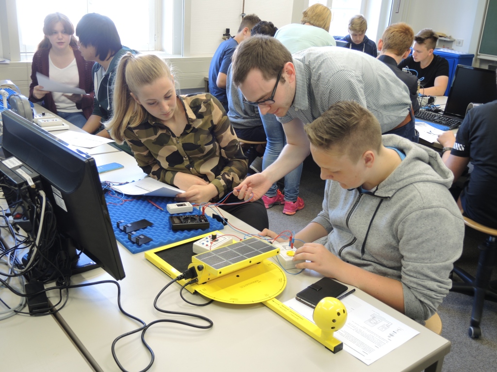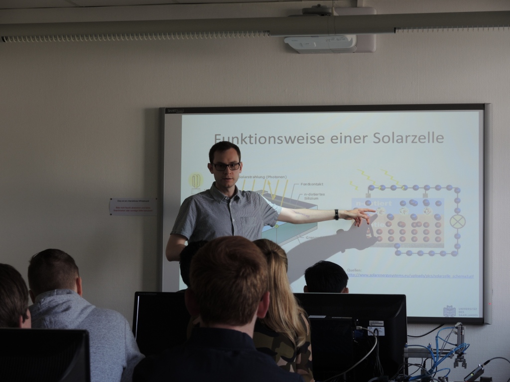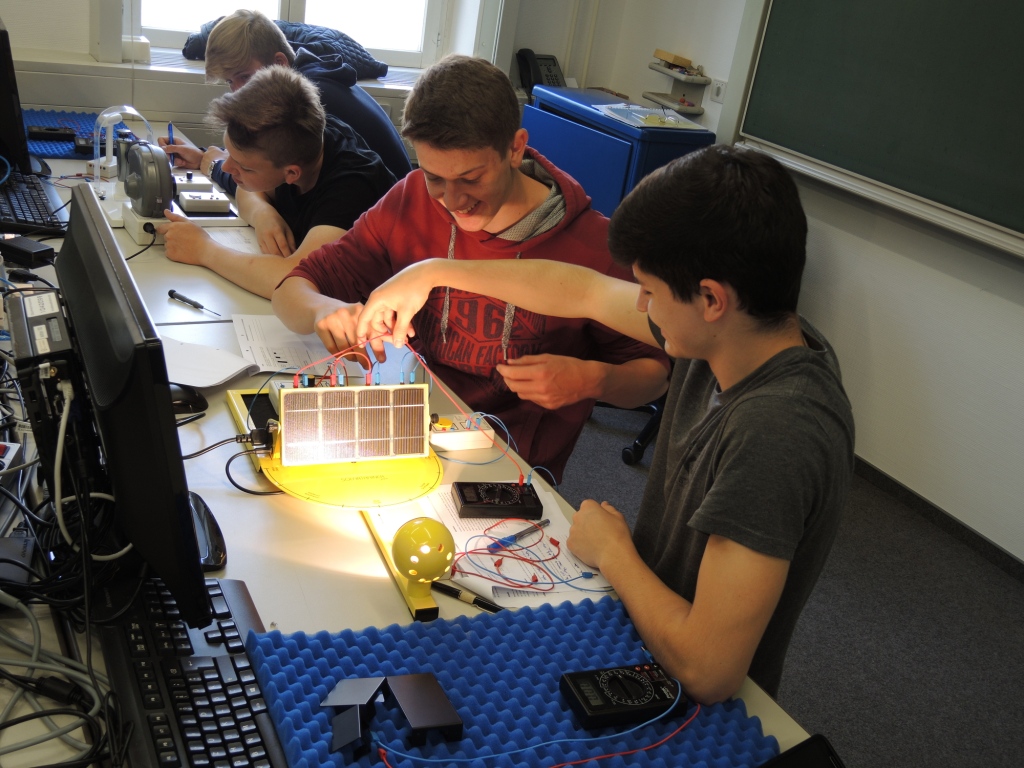 Zum Ende des Schuljahres besuchten die Klassen 9b1 und 9b2 zur Ergänzung des naturwissenschaftlichen Unterrichts und zur Vertiefung von Lerninhalten der Fächer Chemie und Physik des Schuljahres 2015/2016 das NanoBioLab und das EnerTec-Labor an der Universität des Saarlandes. Die Schüler konnten dabei entsprechend ihren Interessen in zwei Gruppen eingeteilt in den Praktikumsräumen der Institute Experimente zur Analyse von Säuren oder zur Funktion von regenerativen Energiewandlern durchführen. So konnten sie die direkte Wandlung von elektromagnetischer Strahlungsenergie in elektrischen Strom durch die Solarzelle untersuchen und an Modellwindrädern die Wandlung von Bewegungsenergie der Luft in elektrischen Strom vermessen und durch Variation des Aufbaus der Windräder deren Wirkungsgrad optimieren. Die Experimente fanden unter sachkundiger Anleitung der Praktikumsbetreuer beider Labore und ihrer Fachlehrer, Herr Schumacher und Herr Ruffing, statt. Der Besuch der Universität wurde durch ein gemeinsames Mittagessen in der Mensa abgerundet.