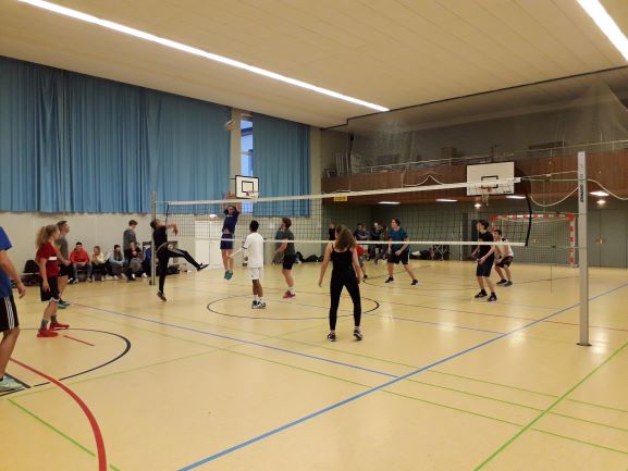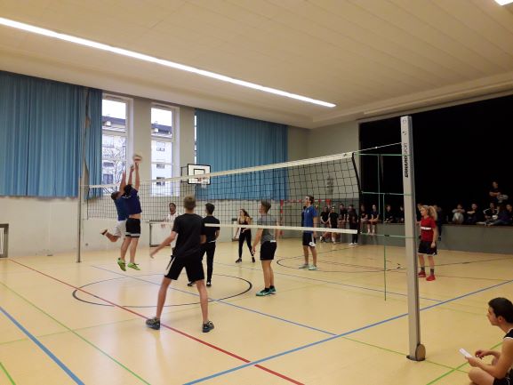 Zum winterlichen Volleyballturnier trafen die beiden Kontrahenten des geteilten 12er-Sportneigungskurs des Gymnasiums am Schloss von Frau Schollenberger aufeinander.