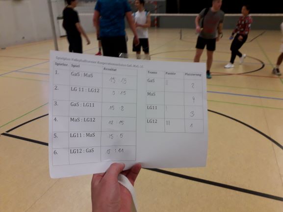 Um ein Volleyballturnier zu ermöglichen, wurden außerdem zwei weitere Mannschaften, der 11er Neigungskurs von Herrn Jager der Marienschule (MaS 11) und der 11er-Neigungskurs des LGs von Herrn Burkhart und Herrn Keller (LG11), hinzugezogen. Der Sportneigungskurs 12 unserer Schule wurde in eine Mannschaft, bestehend aus den Schülern des LGs (LG 12) und eine andere, bestehend aus denen des Schlosses (GaS 12), geteilt. Daniel Kalmes, als einziger Marienschüler, wurde der Einfachheit halber, den LG-Schülern zugeteilt. Die Mannschaft des Schlosses wurde durch hochmotivierte Schüler des Sport Grundkurses von Frau Schollenberger ergänzt.