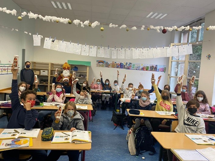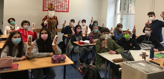 Eine Aktion des Abiturjahrgangs ausgehend von der Volkshochschule hat die Weihnachtszeit trotz der schwierigen Lage mit einer kleinen Geste verschönert. Als Nikoläuse verkleidet zogen die künftigen Abiturienten und Abiturientinnen durch jede Klasse, um nach einem mit den Kindern gemeinsam gelösten Rätsel Schokonikoläuse zu verteilen.