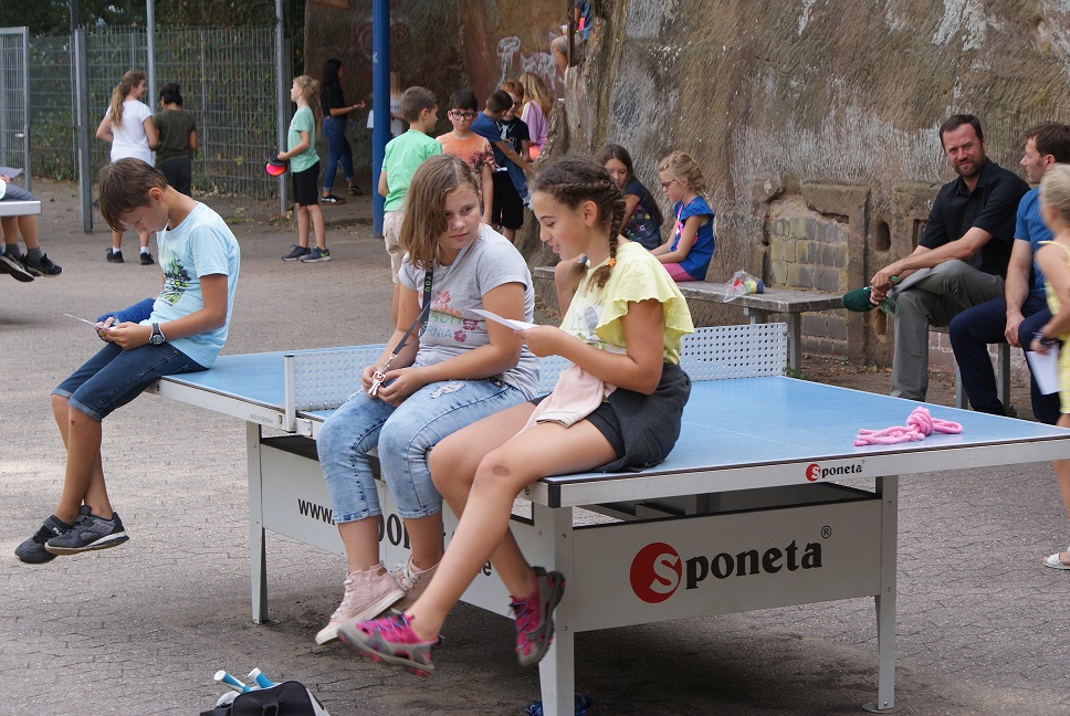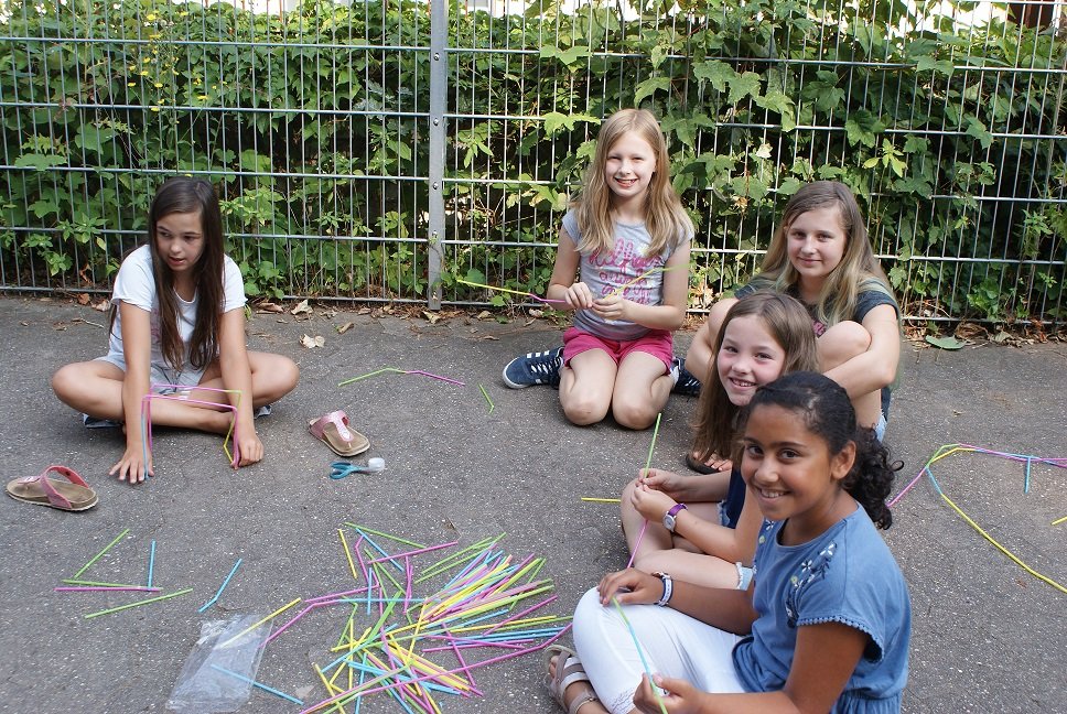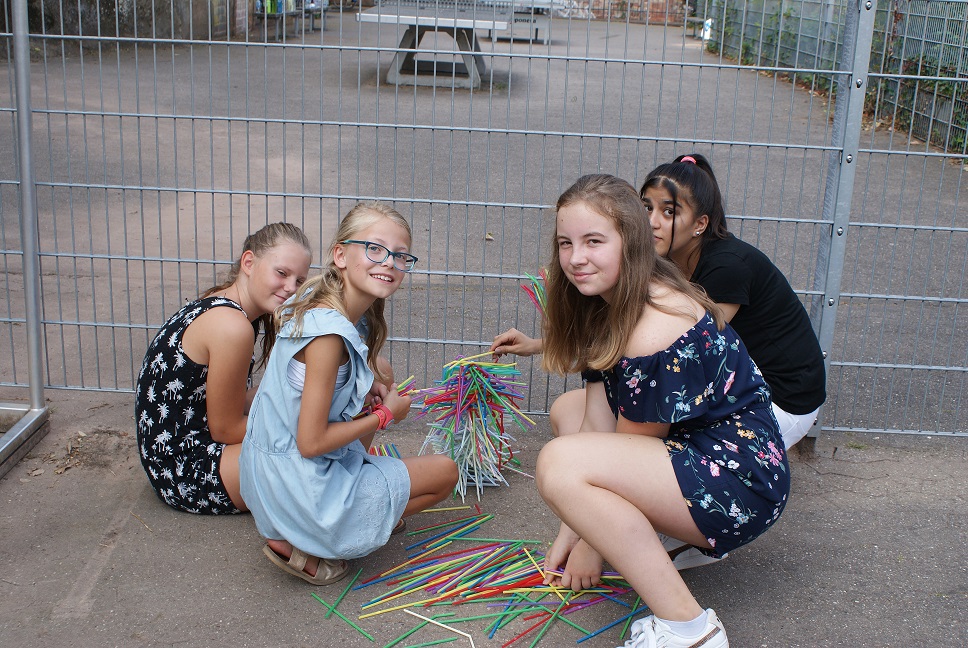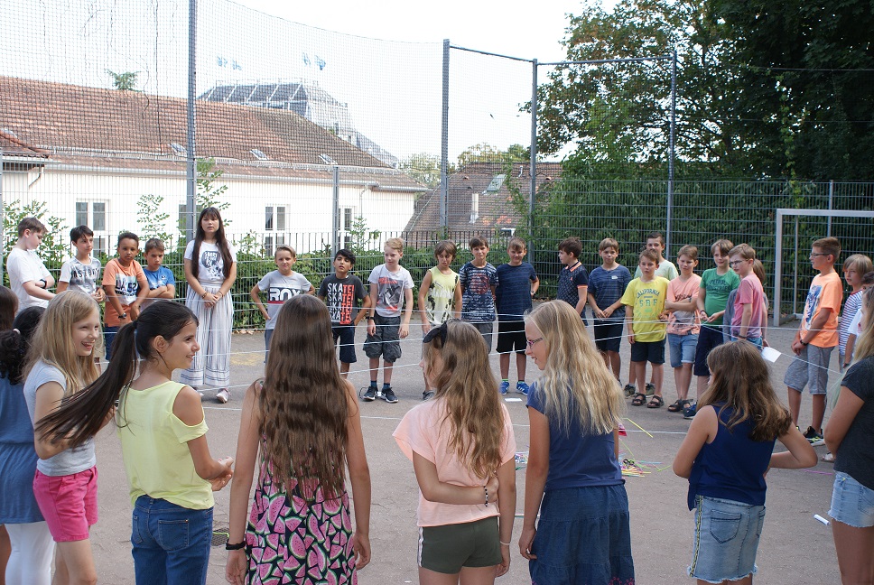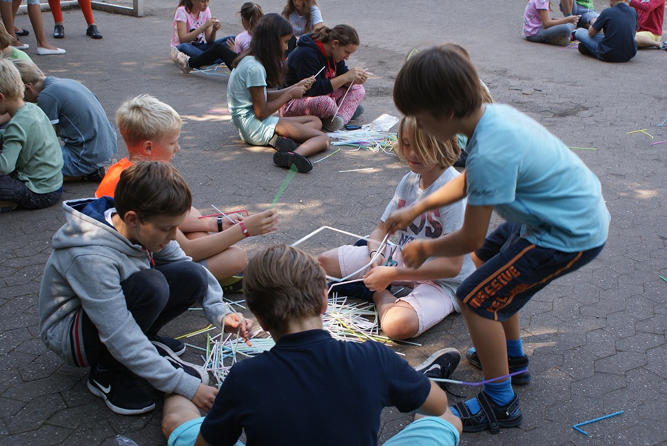 Klassenweise haben die Schülerinnen und Schüler gemeinsam zwei Stunden auf dem oberen Schulhof verbracht. Dabei hat das Wetter wunderbar mitgespielt und uns sommerliche Temperaturen beschert. Zunächst hatten die Kinder die Möglichkeit sich untereinander frei zu beschäftigen. Es standen Brett- und Kartenspiele aber auch Tischtennis, Fußball, Badminton, Seile und vieles mehr zur Verfügung, so dass für jeden was dabei war. In einem anschließenden Spiel ging es darum, kreativ zu sein und in der Gruppe zusammenzuarbeiten. Es galt, aus Plastik-Strohhalmen den höchsten Turm zu bauen. Hier haben sich unsere Schülerinnen und Schüler besonders ins Zeug gelegt und haben sich vieles einfallen lassen, wie auf den Fotos zu sehen ist. Um das Augenmerk danach etwas auf die einzelnen Patenschaften zu richten, haben sich Patenkind und Paten anhand eines kleinen Fragebogen ausgetauscht. Dabei waren Erfahrungen am GaS, Insider-Tips und interessante Geschichten, aber auch persönliche Eigenschaften und Gemeinsamkeiten wichtig. Zurück in der großen Gruppe mit allen Schülerinnen und Schülern gab es zum Schluss eine Feedbackrunde mit einem Wollknäuel. Besonders gut gefallen hat den meisten Kindern die freie Spielzeit, in der sie sich mit ihren neuen neuen Freunden austoben konnten. Aber einig waren sich in einem Punkt alle, nämlich dass sich alle auf ihre Patenschaft sehr freuen und dankbar dafür sind, sich nach sechs Wochen Sommerferien endlich getroffen zu haben.
