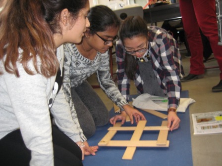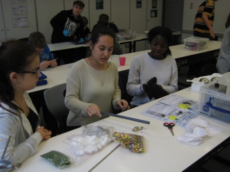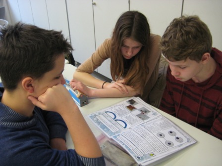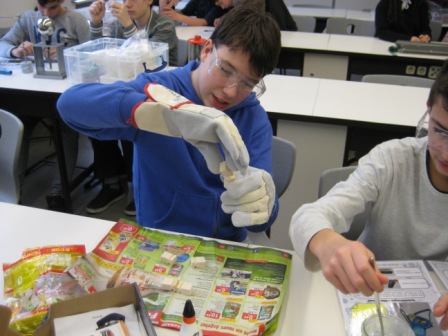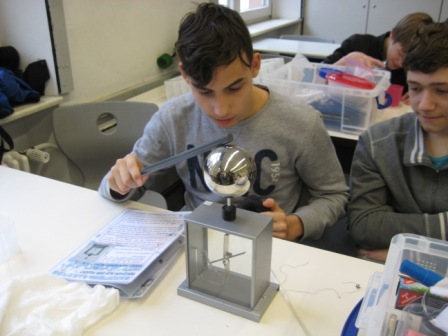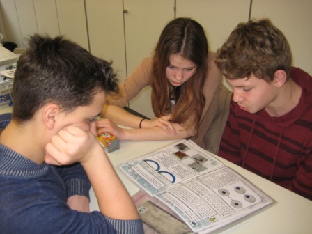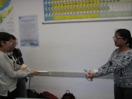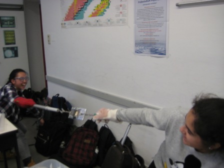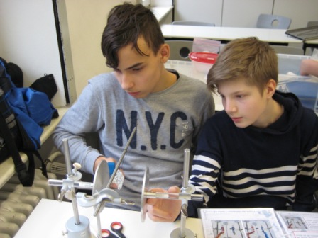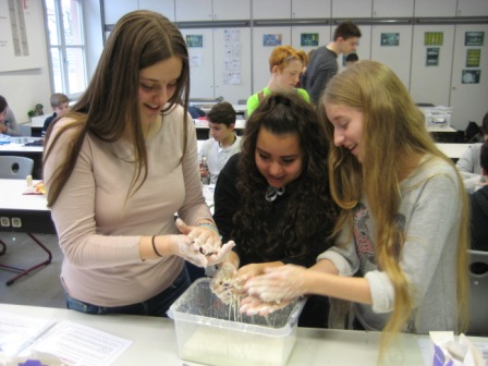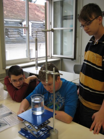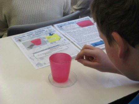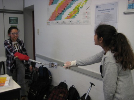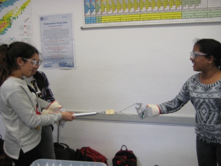 Die Schülerinnen und Schüler hatten nun die Möglichkeit innerhalb von zwei Schulstunden in Dreiergruppen die unterschiedlichen Phänomene zu entdecken und zu begreifen. Anhand der Anleitungsskripte führten sie verschiedene Versuche zu den Themen Haften, Kleben und Reibung durch. Bei Fragen waren nicht wie üblich die Physiklehrerinnen Frau Moik und Frau Mischo die Ansprechpartner, sondern Frau Schuck und Herr Barbian von der Universität des Saarlandes.
