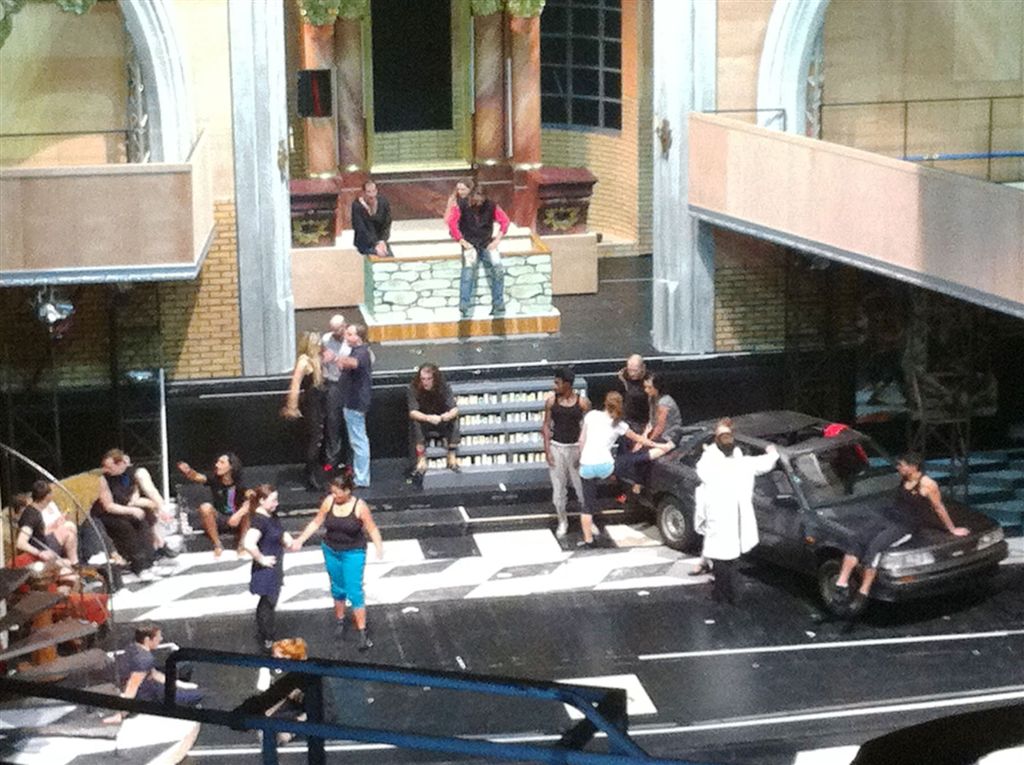 Anschließend durften wir eine Technikprobe miterleben. Die Übertragung der Band und der Solistenmikrofone stand neben der Bühnenprobe im Mittelpunkt. Da ein großer Teil unserer Schüler aus der Musical-AG stammte, kannten sie schon vieles von dem, was sie jetzt bei den Profis beobachteten. Bei allem Respekt vor der professionellen technischen und schauspielerischen Leistung war es doch beruhigend zu sehen, dass hier oft mit denselben Problemen gekämpft wurde, wie wir sie auch aus unserer Probenarbeit kennen.