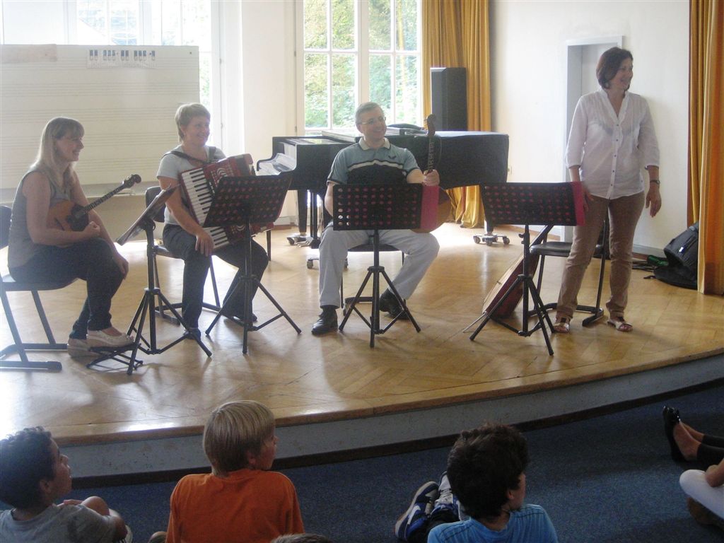 So kam es, dass am Mittwochmorgen drei Klassen unserer Schule in den Genuss eines wirklich ausgezeichneten Musikerlebnisses kamen. Auf höchstem Niveau präsentierten die vier studierten Musiker Folklore aus aller Welt in eigenen, wunderschönen Arrangements. Die Schüler waren sichtlich beeindruckt von dem Klangreichtum der teilweise exotischen Instrumente (Bass-Balaleika, Sopran- und Alt-Domra) und spendeten begeisterten Beifall.