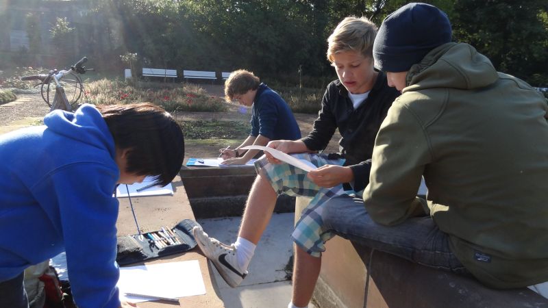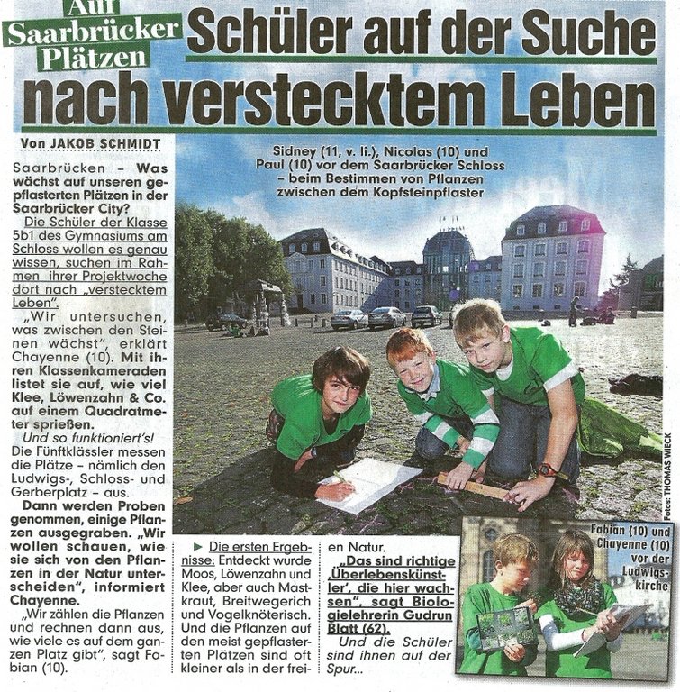 Nachdem der erste Projekttag bereits ein guter Start war und die Planungen für die weiteren Tage von Lehrerseite geklärt wurden, machten sich die Teilnehmer der einzelnen Projekte voller Schwung und Elan daran, die Pläne in die Tat umzusetzen. So sind auch heute wieder viele junge Schloss-Schüler an außergewöhnlichen Lernorten auf Saarbrücker Plätzen unterwegs – und bringen durch das gemeinschaftliche Tragen der grünen Schul-T-Shirts etwas Farbe in das Stadtbild Saarbrückens.