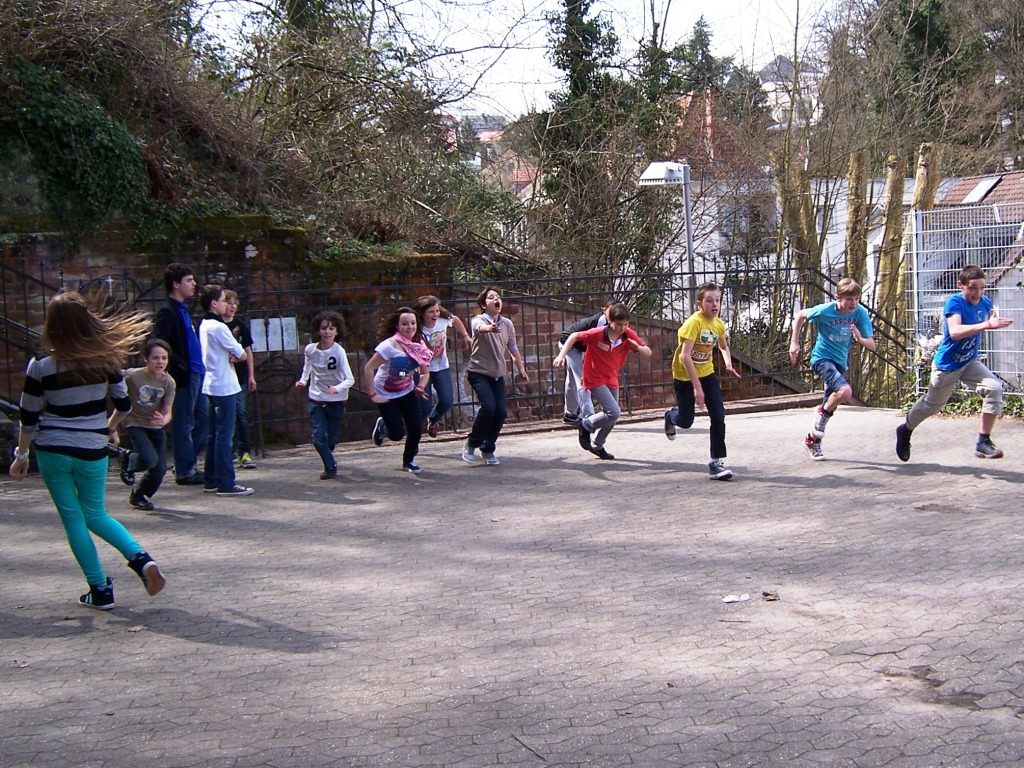 Um 8:45 Uhr holte die 6a1 ihre französischen Austauschschüler an der Saarbahnhaltestelle ab und zeigte ihnen den Weg zur Schule. Dort wurden auf dem oberen Schulhof zunächst einige Kennenlernspiele durchgeführt, um das Eis zu brechen. Am meisten Spaß und Interaktion brachte die Personensuche. Dabei mussten die Schüler anhand eines Fragebogens möglichst viele Schüler der jeweils anderen Nationalität befragen und, sofern eine Frage mit „ja“ beantwortet wurde, Unterschriften sammeln.