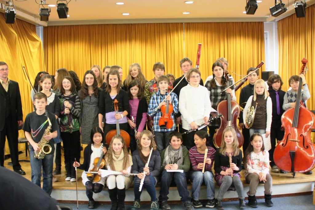 Das Besondere diesmal: Das Konzert begann mit vielen Schülern auf der Bühne (Klassenorchester der 6a1 unter der Leitung von Ewald Becker) und endete mit vielen Schülern auf der Bühne (Kammermusik unter der Leitung von Lothar Fuhr); dazwischen hörten wir solistische Beiträge, wurden von einem Tango mit Sopranino und Akkordeon, einer vierhändigen Polka auf dem Klavier oder einem jiddischen Lied mit Klarinette und Kontrabass in Schwung gebracht, dazwischen gab es ernstere Töne mit Sonaten und Sonatinen, Virtuoses auf der Trompete…