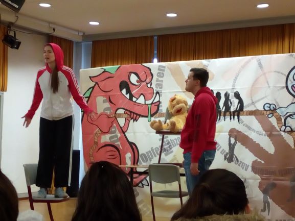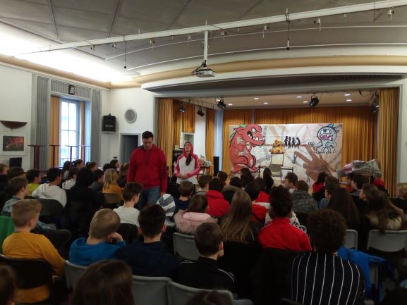 Die Klassenstufe 7 kam am Freitag, den 18.01.19 in den Genuss einer ganz besonderen Doppelstunde: Die Aula wurde zum Theatersaal und Svenja Otto und Richard Rabeus vom Ensemble Radiks aus Berlin fesselten alle mit dem Stück „Wir waren mal Freunde“, der Geschichte des 16-jährigen Joscha, der zwischen die Fronten gerät. Seit er bei einem Brandanschlag auf ein leerstehendes Gebäude einen Obdachlosen gerettet hat, steckt er in einer Menge Probleme. Denn er wird nicht etwa als Lebensretter gefeiert, sondern mit dem Vorwurf konfrontiert, er selbst hätte das Haus angezündet, das bald als Unterkunft für Geflüchtete hätte dienen sollen. Wie kann Joscha seine „Ehre“ retten und seine ehemalige Freundin aus Kindheitstagen, die türkischstämmige Melek, davon überzeugen, dass er eigentlich ein super Typ ist? Es entwickelt sich ein packendes Stück über Themen wie Vorurteile und Rassismus, aber vor allem Werte wie Respekt, Freundschaft und die Entwicklung einer eigenen Identität.