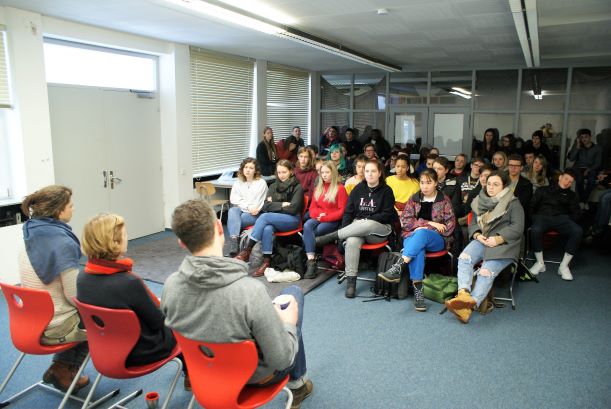 Nach dem Stück folgte ein gut dreißigminütiges Nachgespräch, von dem die Schülerinnen und Schüler mehr als rege Gebrauch machten und jede Menge positives Feedback und Fragen rund um das Stück und Theater-/Schauspielarbeit stellten.