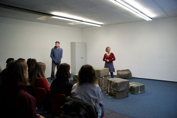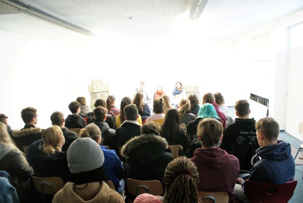 Nicht nur aufgrund der räumlichen Nähe, sondern auch ob der Qualität und sympathischen Menschen liegt nichts näher, als das Theater Überzwerg dahingehend anzufragen. Diese haben jährlich ein sogenanntes Klassenzimmerstück parat, so dass das Gastspiel “Fluchtwege” für beide Seiten eine perfekte Abwechslung im “normalen” Alltag darstellte. Im proppevollen Raum 007, in dem in Teilen der Unterricht im Fach Darstellendes Spiel stattfindet, sahen 47 Schülerinnen der DS-Kurse 10, 11 und 12 eine gelungene Inszenierung, bei der die beiden Schauspieler Eva Coenen und Nicolas Bertholet – begleitet von Theaterpädagogin Felicitas Becher – zur Höchstform aufliefen. Das Erzähltheaterstück “Fluchtwege” von Nick Wood ist seit 2011 im Programm der Überzwerge – ungewöhnlich lang, was zum einen an der hohen Anfrage und zum anderen der stets aktuellen Thematik “Migration” liegt.