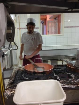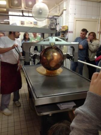 Nous avons vu comment les bonbons sont fabriqués. D’abord le sucre est versé dans de l’eau contenue dans les chaudrons en cuivre, chauffés au gaz puis le sirop de glucose est ajouté.