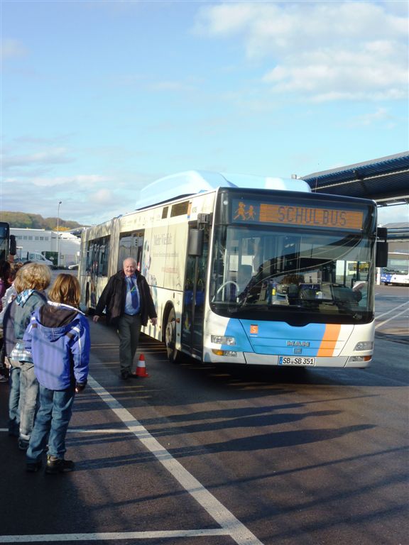 Im theoretischen Teil hat Herr Haupt von der Saarbahn anhand von Filmausschnitten Themen erarbeitet, wie z.B. “Was kann man tun, wenn Jugendliche oder Erwachsene andere in der Saarbahn bedrängen?”, “Welche gefährlichen Situationen entstehen an Bushaltestellen und während der Fahrt?”. Die Beteiligung der Schüler war außerordentlich rege, so wollten sie z.B. auch wissen, was man tun könne, wenn der Bus voll ist, ob die Fahrer keine Freizeit hätten und vieles mehr.