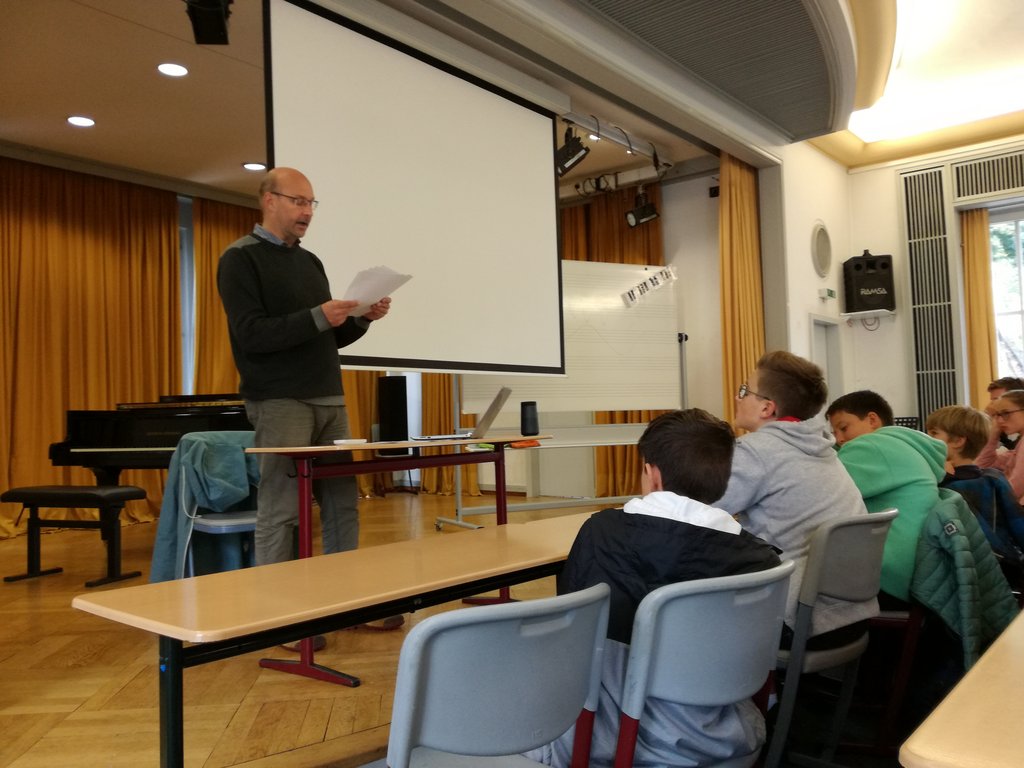 Prof. Frank Wörner, der Initiator und Regisseur des Stücks, der die Klasse 7a schon öfter mit seinen Gesangsstudenten besucht hat, kam auch diesmal wieder vorab in die Klasse, um mit den Schülern über seine Herangehensweise als Regisseur zu sprechen. Aus welchen Perspektiven kann man einen Text lesen? Wie entwickelt man Figuren, wie muss man sie auf der Bühne führen? Wie kommt man zu einem Kostümentwurf, was müssen Sänger auf der Bühne beachten, wenn sie gleichzeitig singen und spielen?