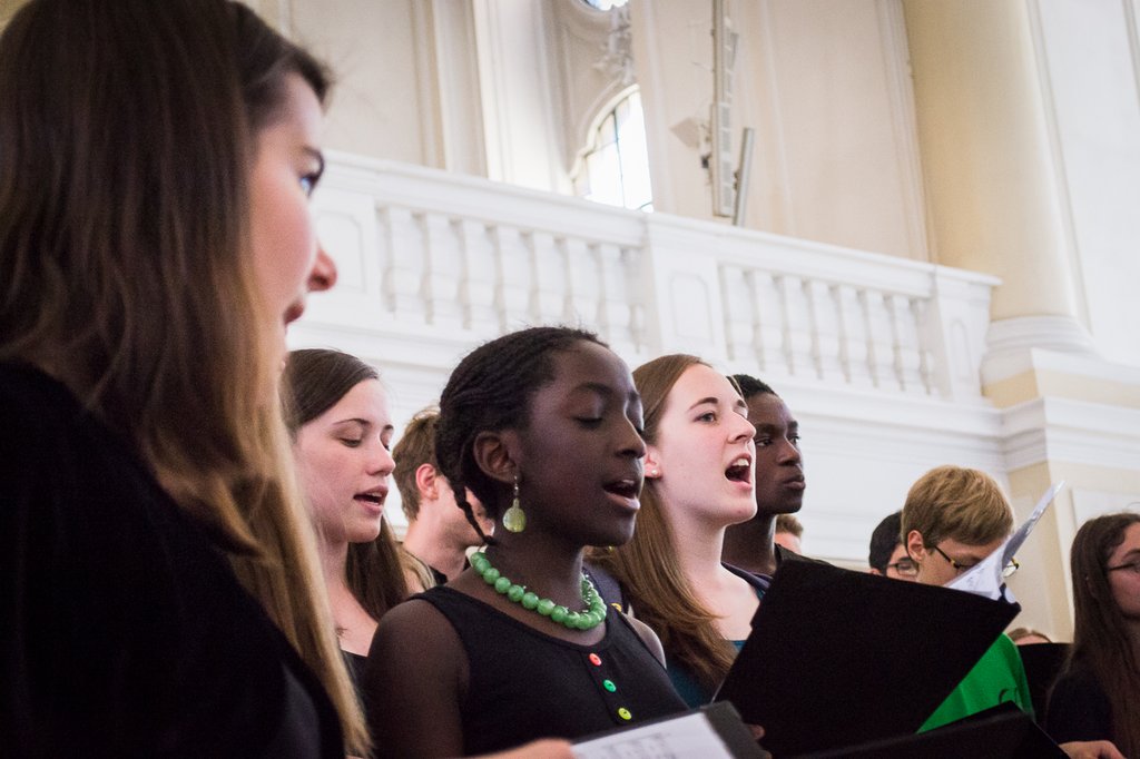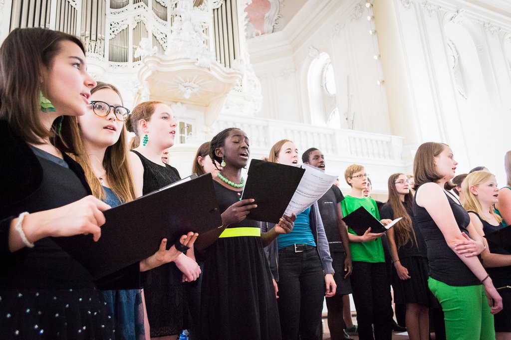 Zum anderen übernahmen der Chor (um die 7a1 und den Musik-Grundkurs, Klasse 11, von Herrn Ernst erweitert) unter der Leitung von Manuela Simmler und ein extra für die Veranstaltung gegründetes Bläserensemble unter Leitung von Matthias Ernst die musikalische Umrahmung der Eröffnungsveranstaltung in der Ludwigskirche, die auch von unserem Bildungsminister Ulrich Commerçon, Schirmherr der Veranstaltung, besucht wurde.