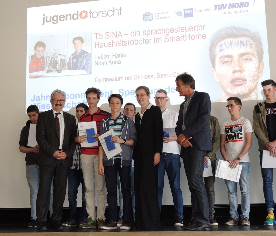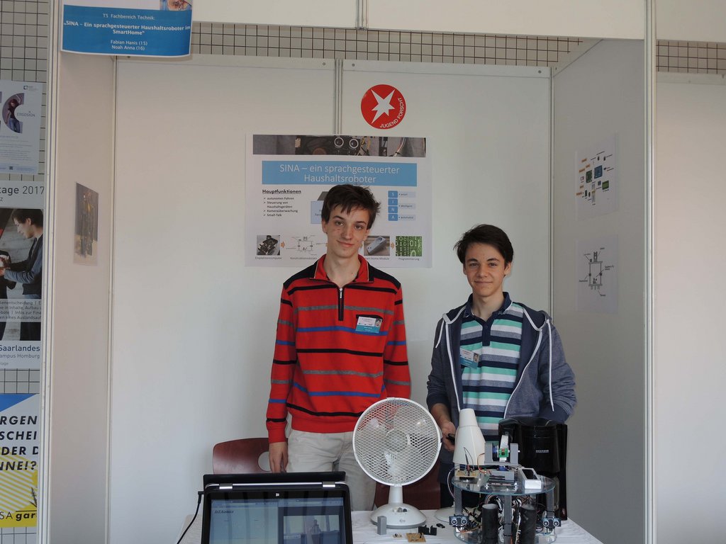 Einmal mehr gelohnt hat sich die Teilnahme von Schülern unserer Schule am Landeswettbewerb “jugend forscht 2017”. Betreut von Mathematik- und Physiklehrer Herrn Thomas Ruffing, der für seine engagierte Förderung der jungen Talente ebenfalls mit einem Preis ausgezeichnet wurde, konnten Fabian Hanis und Noah Anna (beide Klassenstufe 10) die Jury mit ihrem Projekt “SINA – ein sprachgesteuerter Haushaltsroboter im SmartHome” überzeugen – und erreichten einen hervorragenden zweiten Platz.