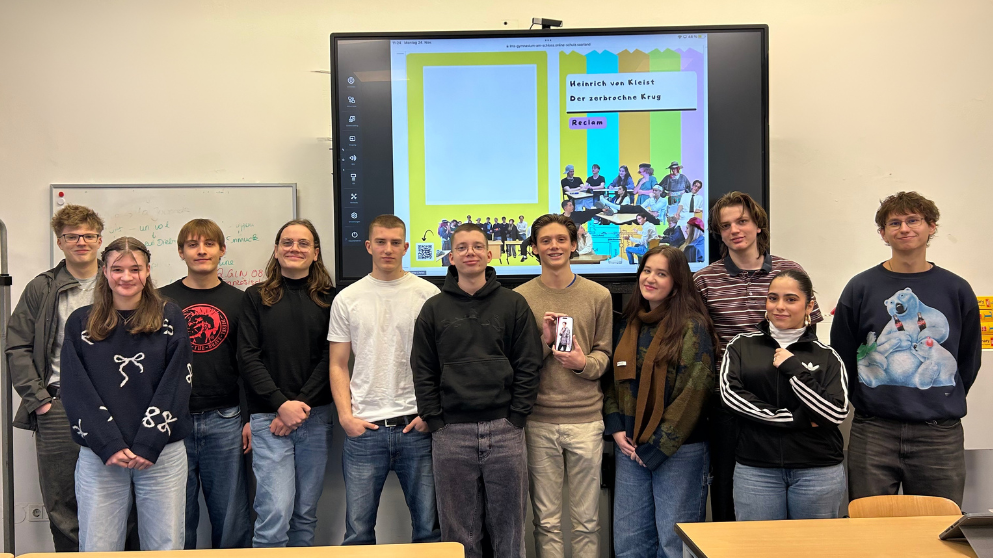 Der Deutsch-Grundkurs (Klassenstufe 12) von Frau Christ hat beim Coverwettbewerb des Reclam Verlags 2025 zu dem Werk „Der zerbrochne Krug“ (Heinrich von Kleist) eine herausragende Platzierung erreicht: Unter 450 Einsendungen aus ganz Deutschland schaffte es der Kurs unter die Top 30 – und erhält zusätzlich einen Sonderpreis mit Überraschungspaketen sowie einer Bücherspende für die Schulbibliothek.