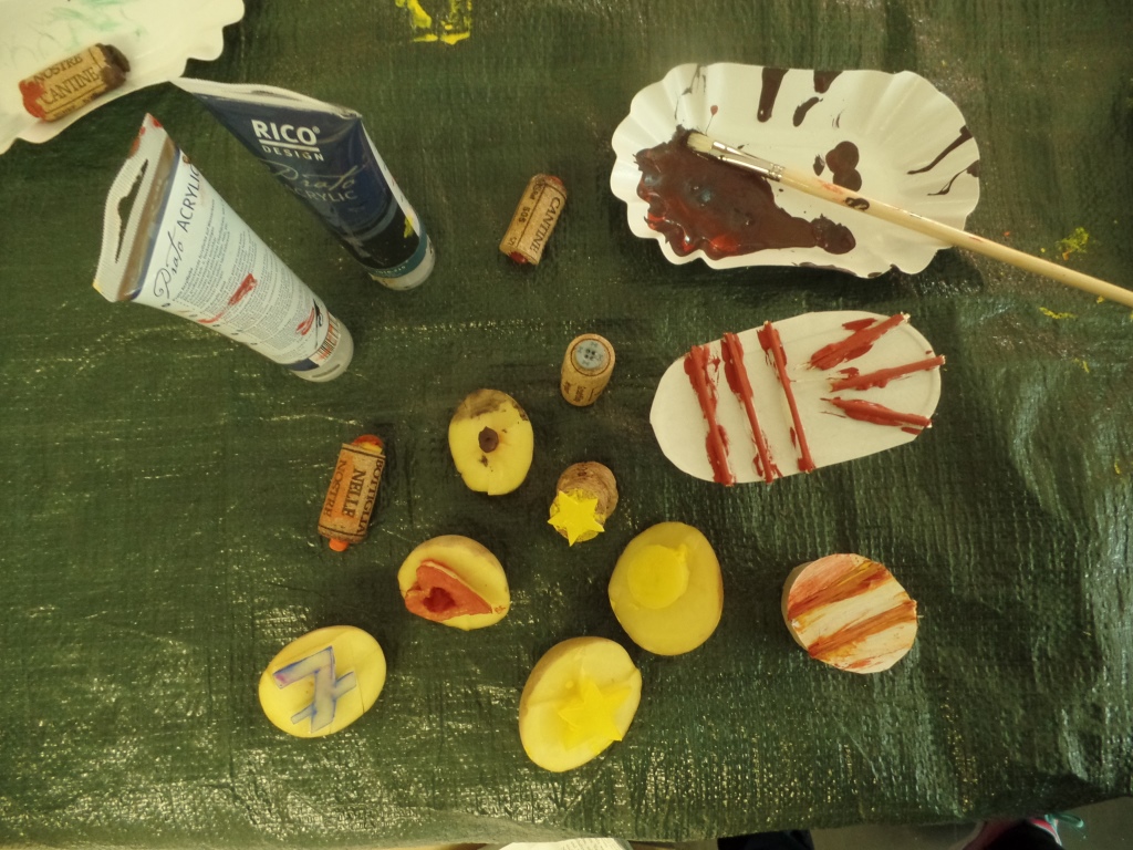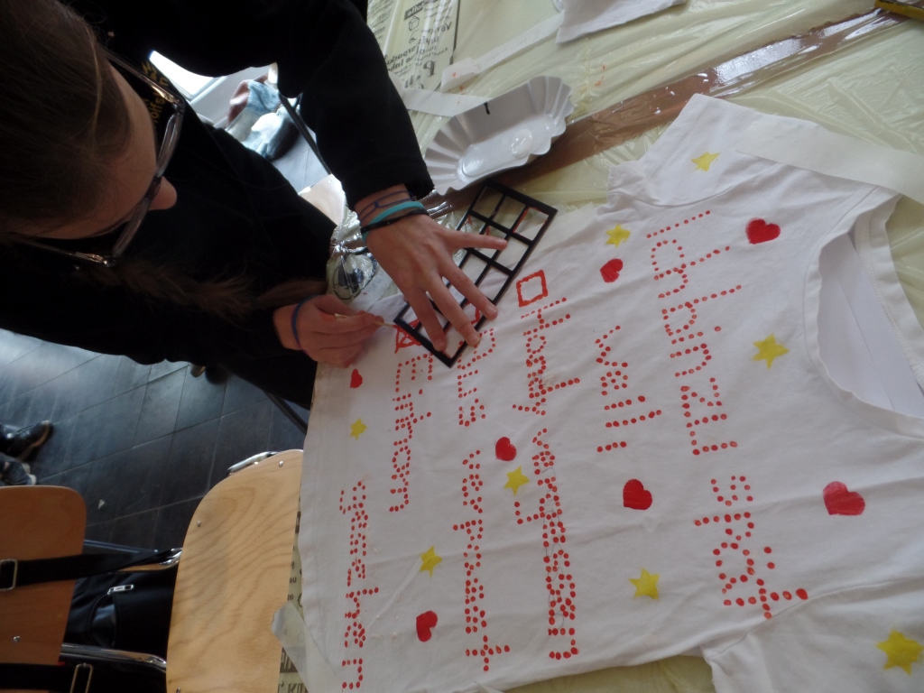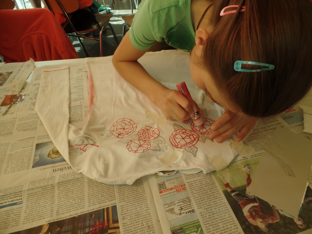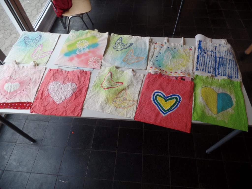 In der ersten Woche der Osterferien 2017 (10.04.2017 bis 14.04.2017) führten wir mit den Schülerinnen und Schülern ein Textilprojekt mit Druckgestaltung durch. Aus Kartoffeln, Korken, Moosgummi, Holzstücken und Knöpfen stellten wir selber Stempel her. Zunächst fertigten wir Probedrucke mit Acrylfarbe auf Papier an. Jedes Kind übertrug schließlich seine vorskizzierten Entwürfe auf Papier und im letzten Schritt auf ein eigenes T-Shirt und eine Stofftasche. Wir danken der Künstlerin Zsuzsánna Barabás für das tolle Projekt!