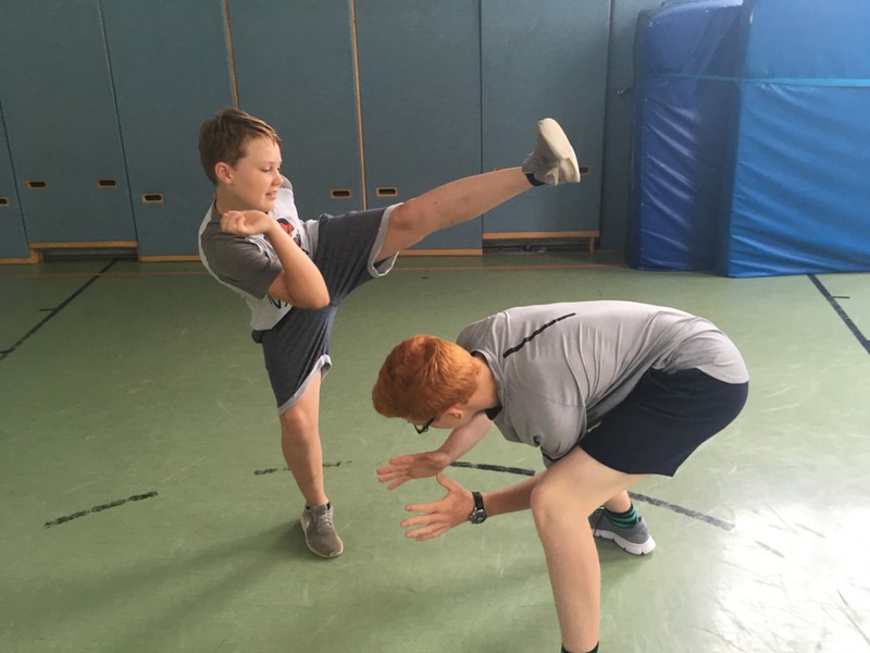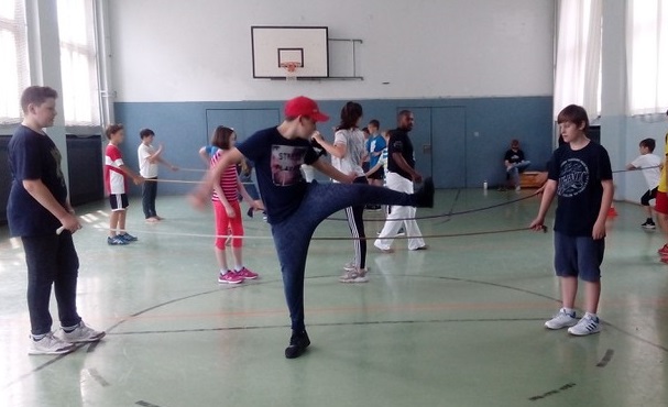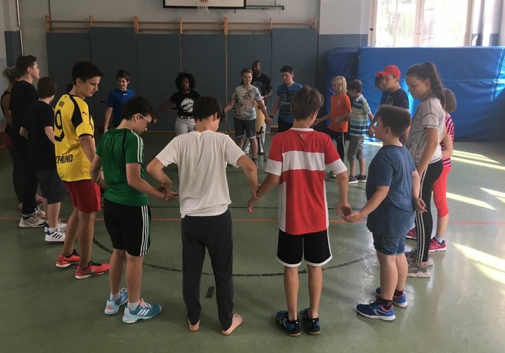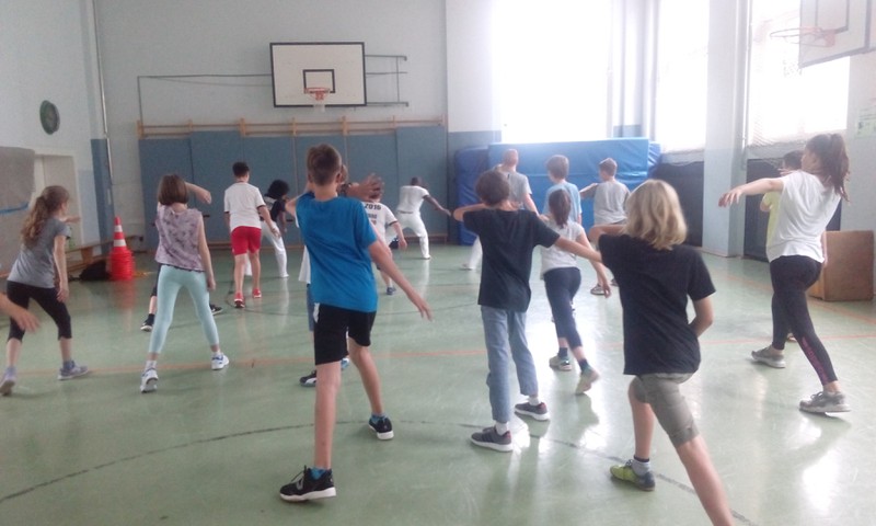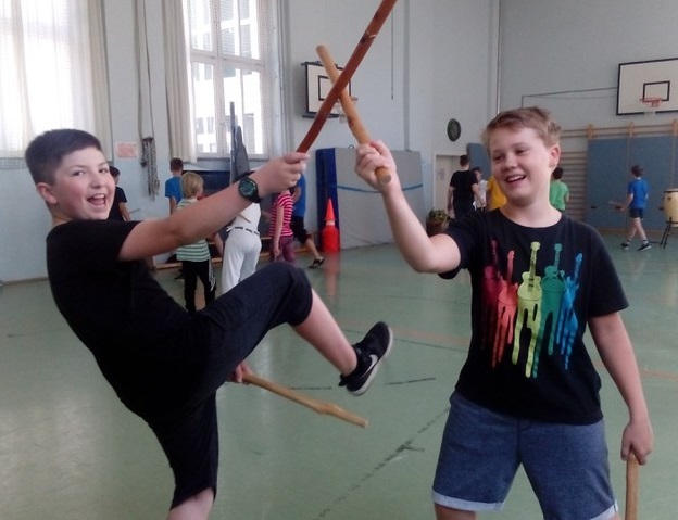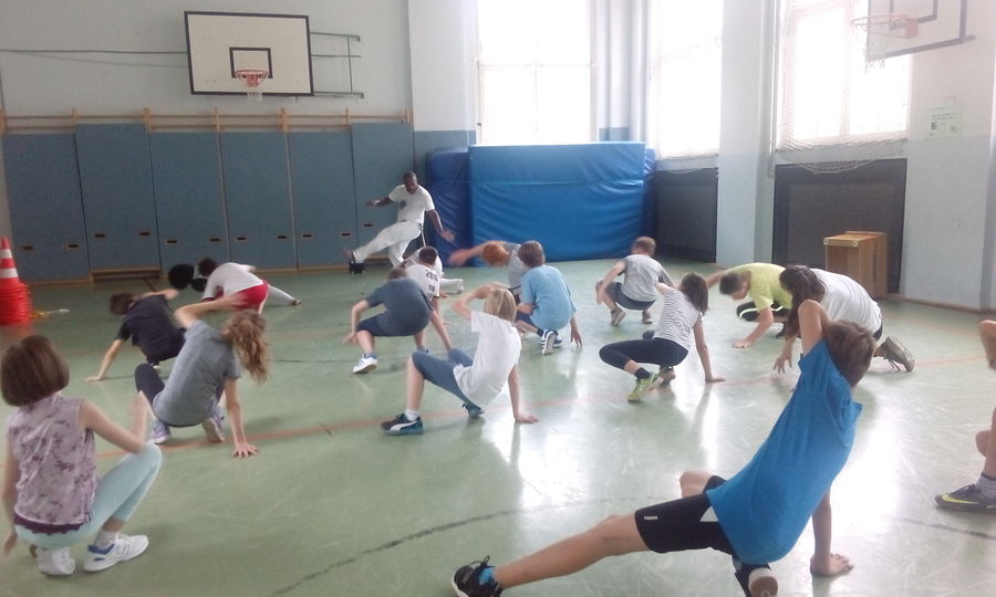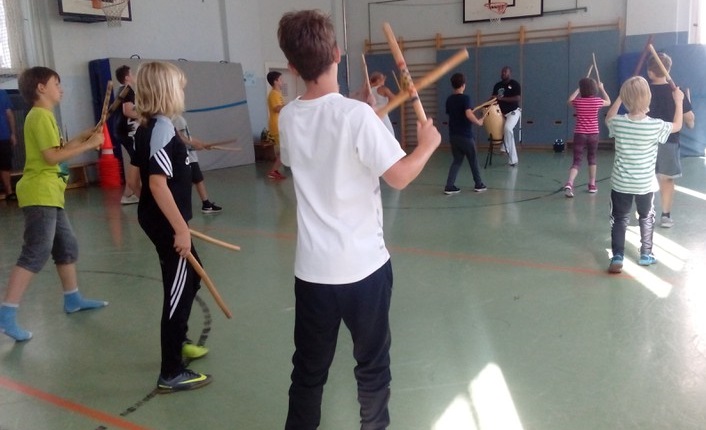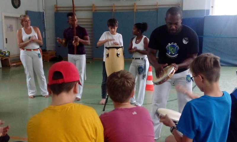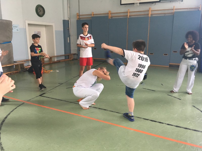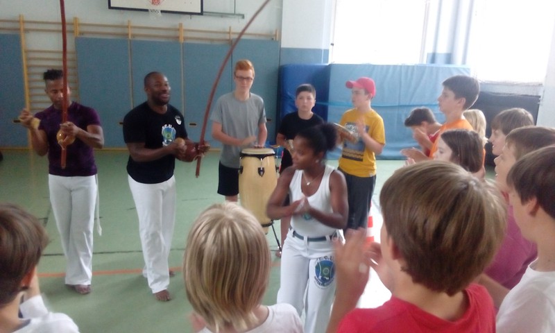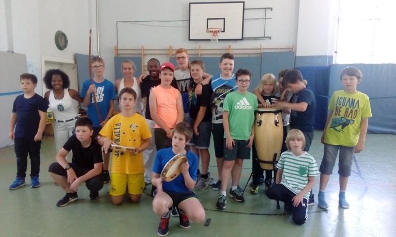Vom 10.07. – 14.07.2017 führten wir einen Capoeira-Workshop durch. Die vielseitige afrobrasilianische Kunstform besteht zum einen aus Tanz, Musik, Kampf, Akrobatik und Spiel. Zum anderen verkörpert sie Kultur und Philosophie. Wir lernten den Ursprung und die Geschichte dieser Kunstform kennen: Capoeira wurde während der Kolonialzeit von verschleppten Sklaven aus Brasilien und Afrika praktiziert und weiterentwickelt. Die Kinder lernten die Grundbewegungen der Capoeira sowie die dazugehörige Musik kennen, die Gesang und Grundrhythmen der Instrumente beinhaltet. Durch die sogenannte „Roda“ (portugiesisch für „Kreis, Runde“), in der alle in einem Kreis stehen, tanzten und sangen wir gemeinsam. Ein weiterer Baustein des Projektes war Maculelé, ein Stocktanz, der ein wichtiger Teil der Capoeirakultur ist. Da der Grundschritt der Capoeira ein Wiegeschritt ist und es sehr viele tiefe Bewegungen in der Hocke bzw. Akrobatik kopfüber (Radschlag, Kopfstand etc.) gibt, steigerte das Projekt unsere Fitness!!!!
