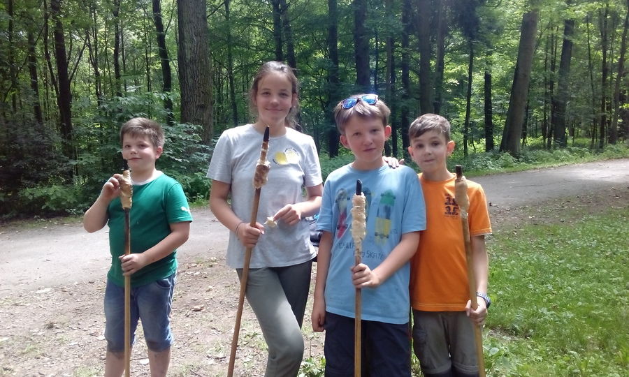 In den letzten 3 Tagen (19.07-21.07.2017) der Ferienbetreuung führten wir ein erlebnispädagogisches Projekt im Wald durch. Bei interaktiven Spaziergängen, Bauen von Hütten und Durchführen von teamorientierten Spielen im Freien lernten wir die Natur bewusst erleben und (be)greifen. Unsere Handgelenke wurden durch „Tundeln“ verschönert. Mit dieser Technik stellten wir Armbänder her. Außerdem buken wir wie die Steinzeitmenschen Stockbrot über dem Feuer und lernten den Umgang mit Pfeil und Bogen.