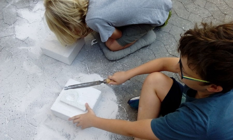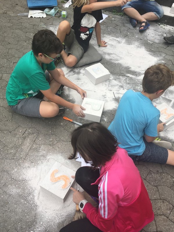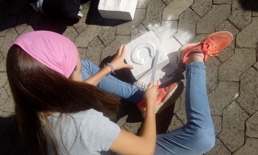 In den ersten beiden Tagen (17.07. – 18.07.2017) der dritten Woche arbeiteten wir kreativ mit Ytong Steinen.* Zuerst zeichneten wir den Anfangsbuchstaben unseres Nachnamens in 3D auf Papier, anschließend feilten und meißelten wir die Initialen in die Steine.